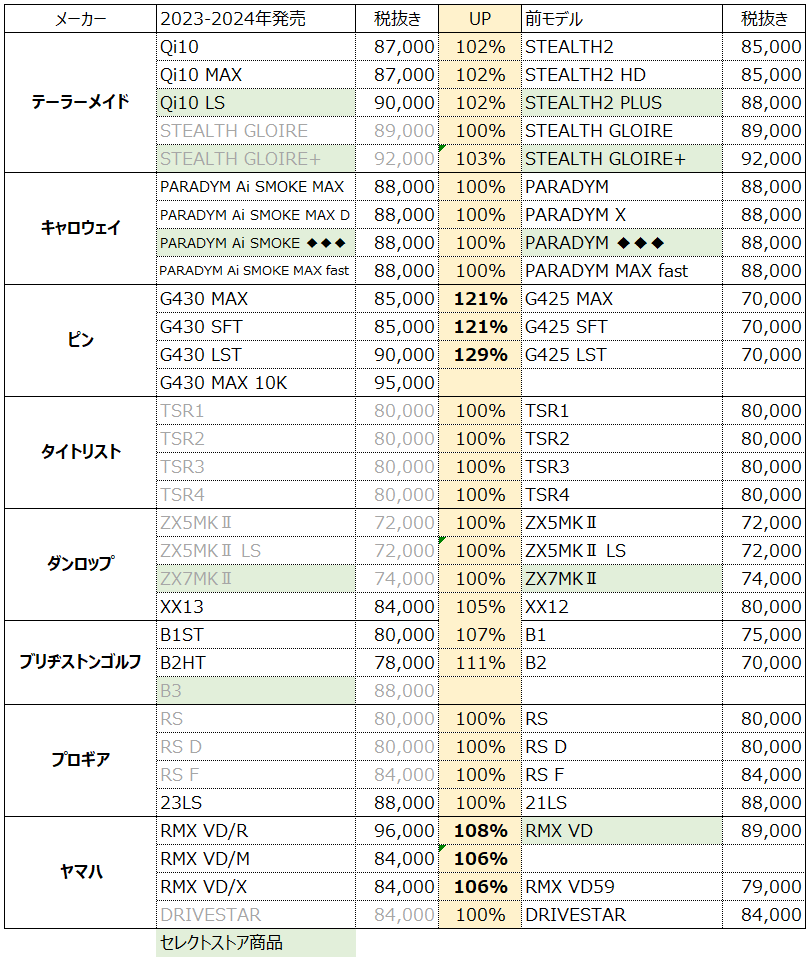 表の価格は、メーカー純正シャフトが入ったドライバーの税抜き定価になっています。店頭価格はセレクトストア商品(店舗限定商品)は定価販売で、それ以外は10%オフになっていると思います。また、カスタム系シャフトの場合は更に価格が高くなります。