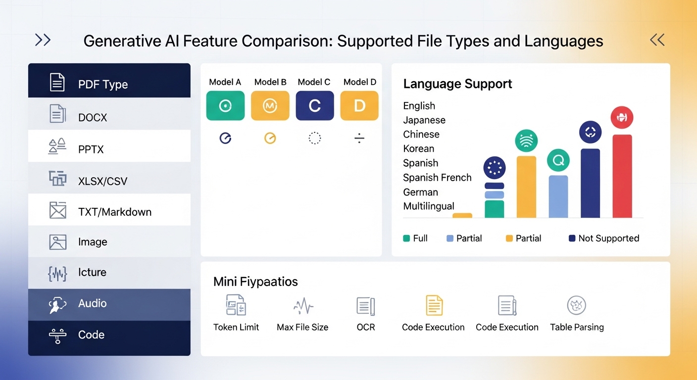 主要な生成AI(ChatGPT、Gemini、Claude、Grok)が、どのようなファイル形式や言語を解析できるか、またできないかをまとめました。