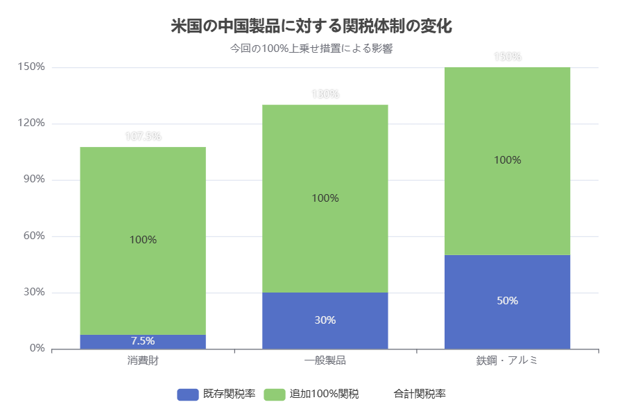 適用対象と税率: 今回発表された関税は中国から米国へのあらゆる輸入品を対象とし、既存の関税率に100%を上乗せする形で課税されます。例えば、ある中国製品に現在25%の関税がかかっている場合、今回の措置により合計125%の関税が課される計算です。このため、一部の品目では実効税率が100%を超える可能性があります。実際、トランプ大統領は「中国が現在支払っているいかなる関税にも上乗せして100%の関税を課す」と明言しており、中国製品への関税率は品目によって50%(鉄鋼・アルミ)から7.5%(一部消費財)まで様々ですが、これらすべてに100%を上乗せする構想です。