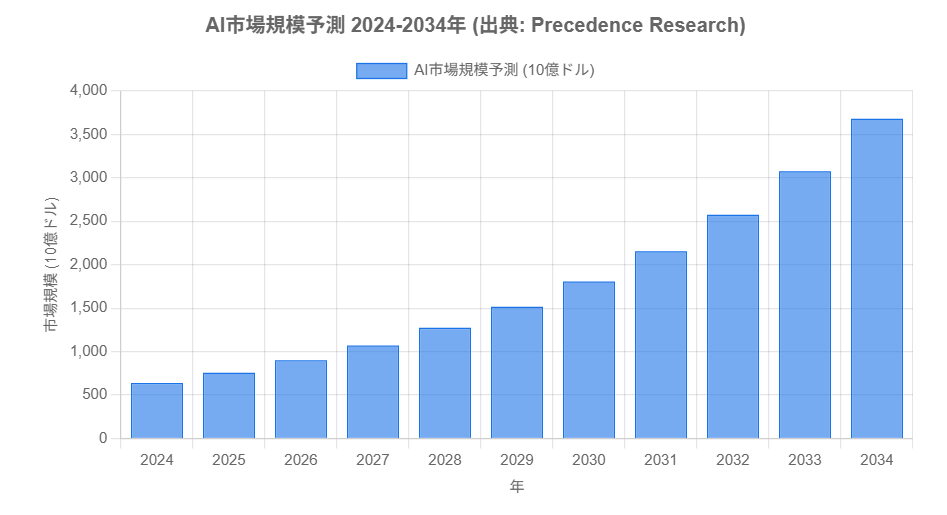 技術的進歩と経済的価値の創出を背景に、AI市場は驚異的な成長を遂げ、前例のない規模の投資を引き寄せている。市場調査会社のPrecedence Researchは、世界のAI市場規模が2025年の約7576億ドルから、年平均成長率(CAGR)19.20%で拡大し、2034年には3兆6800億ドルに達すると予測している。