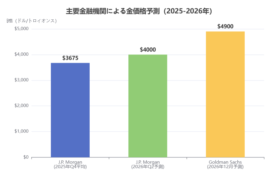 主要金融機関の予測では、金価格の上昇局面は当面続くとの見方が多くを占めます。例えばゴールドマン・サックスは2025年10月に金価格の予測を大幅上方修正し、2026年末時点でオンスあたり4,900ドルと予測しました(前回予測は4,300ドル)。この背景には、西側の金ETF(上場投資信託)への資金流入が強まり、主要国中央銀行による金購入も続くとみられることが挙げられています。ゴールドマン・サックスは「民間部門が比較的小規模な金市場への分散投資を進めることで、ETFの保有量が金利動向から予想される水準を上回る可能性があり、金価格予測には依然上方リスクが残る」と述べています。