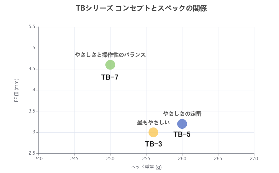 • コンセプトと特徴: TB-3は「最もやさしい」というコンセプトで、TB-5を上回る寛容性とやさしさを追求しました。TB-5は「やさしさ」をシリーズの核とし、初心者からアベレージまでを幅広くカバーする設計です。TB-7は「やさしすぎない、難しすぎない」をコンセプトに、打感と操作性を意識したモデルです。つまりTB-3は「最もやさしい」、TB-5は「やさしさの定番」、TB-7は「やさしさと操作性のバランス」という違いがあります。