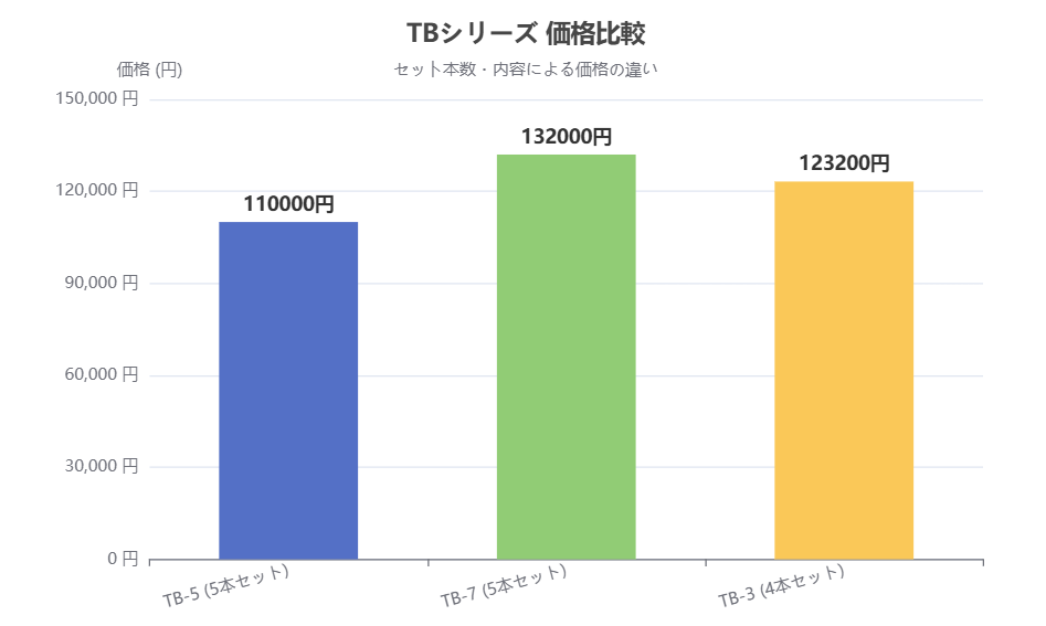 • 価格: TB-5は5本セットで約110,000円前後(税込)と比較的手頃で、TB-7は5本セットで132,000円とやや高めです。TB-3は4本セットで123,200円と、TB-5とTB-7の中間的な価格設定です。価格は主にヘッド数による差ですが、TB-3はTB-5より少し高いのは性能向上と価格改定によるものと推測されます。