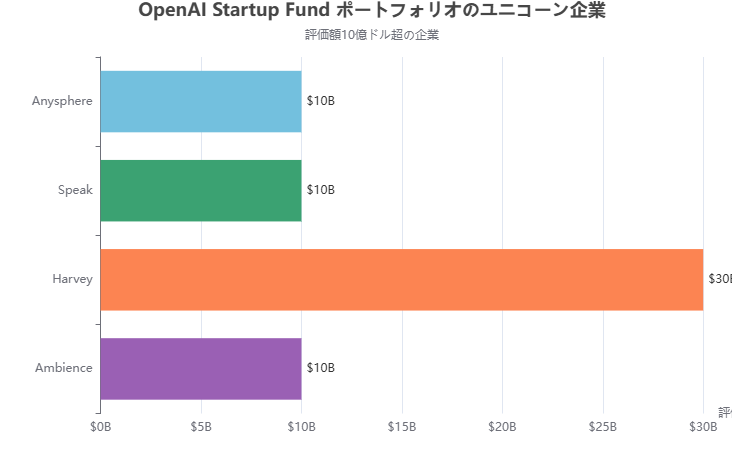 これら出資先企業のうち、一部はユニコーン(評価額10億ドル超)に成長しています。例えばAnysphereは評価額約10億ドル、Speakは評価額10億ドル、Harveyは30億ドル規模、Ambienceは10億ドル超に達しています。OpenAI Startup Fundの出資先企業のうち、ユニコーン化した企業は以下の通りです。