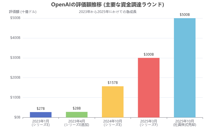 OpenAIの評価額は、主要な資金調達ラウンドを経て飛躍的に高まっています。