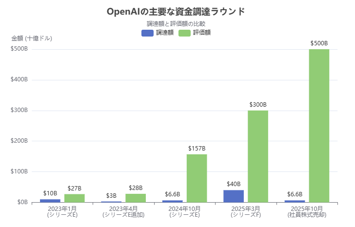 OpenAIの主要な資金調達ラウンドの規模を比較すると、その投資家への恩恵が一目でわかります。以下のグラフは、OpenAIの主要な資金調達ラウンドにおける調達額と評価額の関係を示しています。