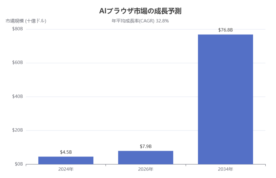 • AIブラウザの市場拡大: 各社がAI機能を備えたブラウザを投入し始めており、AIブラウザ市場は飛躍的な成長が見込まれています。2024年時点での市場規模は約45億ドルとされていますが、2034年には768億ドルに達するとの予測もあります。以下のグラフは、AIブラウザ市場の成長予測を示しています。
