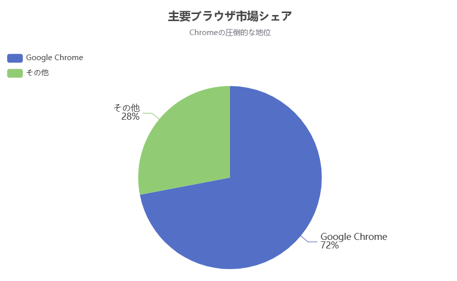 ChatGPT Atlasの登場は、ブラウザ市場における新たな競争を生み出しました。特に、Google Chromeとの競合が大きな注目を集めています。Chromeは現在世界で最も普及しているブラウザで、市場シェアで約70%を占めるほどの圧倒的な地位を築いています。この市場シェアの割合は、以下のグラフで視覚的に確認できます。