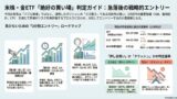 長期金利が高い状況が続くと、金利敏感株(ハイテク、成長株、不動産など)には逆風となります。債券投資では長期債の値下がりリスクに注意が必要。一方で、利回り水準が十分に上がったタイミングでは、債券の「買い場」になる可能性もあります。