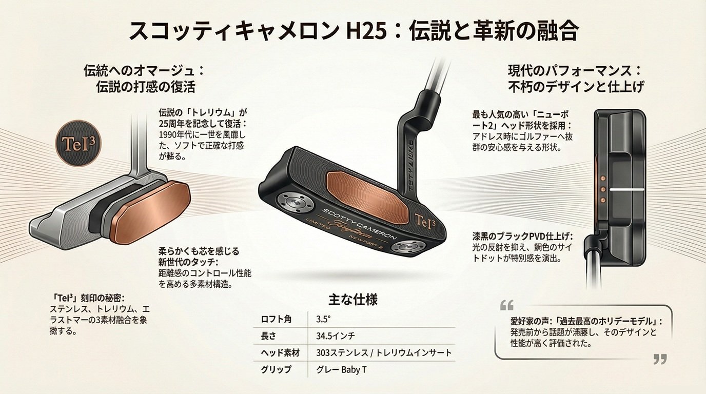世のゴルファーを魅了し続けるスコッティキャメロンが、2025年ホリデーシーズンに再び伝説の素材をフィーチャーした限定パターをリリースしました。毎年話題となる“マイガール”と“ホリデー”2モデルのうち、今回レポートするのは後者――素材の歴史と現代パフォーマンスが見事に融合したH25 リミテッド トレリウム ニューポート2です。 (Scotty Cameron)