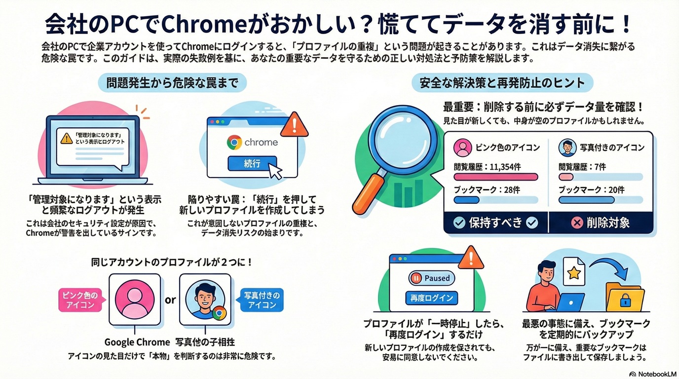 既存の個人利用を想定したChromeプロファイルに企業アカウ ントでログインを試みたため、 Chromeがデータ分離を促す確認画面を繰り返し表示していた と推測されました。 -