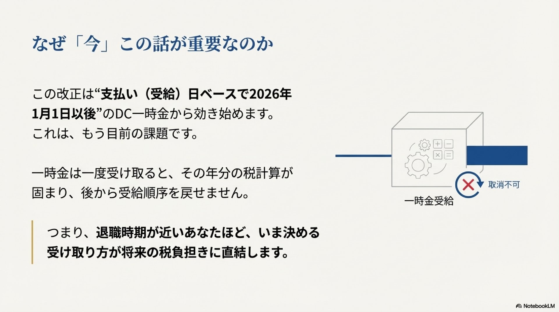 この改正が適用されるのは、支払い(受給)日ベースで2026年1月1日以後に受け取るDC一時金からとなります。一度受け取った一時金の税務計算を後から変更することはできないため、退職時期が近いクライアントほど、現時点での戦略決定が将来の税負担に直結します。