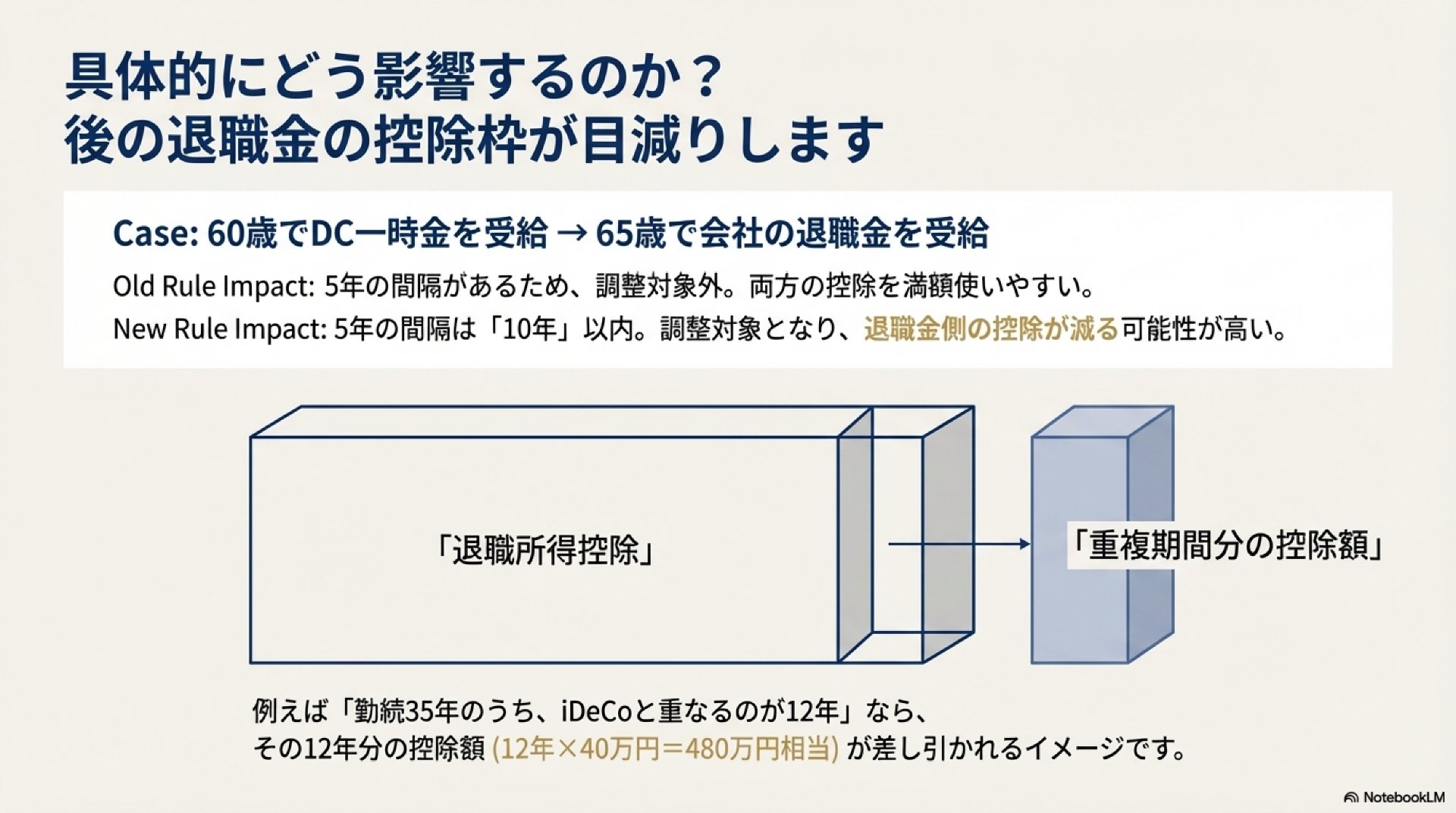 最も影響を受けやすい代表的なケースは、「60歳でDC一時金を受け取り、65歳で会社の退職金を受け取る」という、これまで一般的であったプランです。旧ルールでは5年の間隔があるため控除調整の対象外でしたが、新ルールではこの期間が10年未満となるため、控除調整の対象となり、税負担が増加する可能性が高まります。