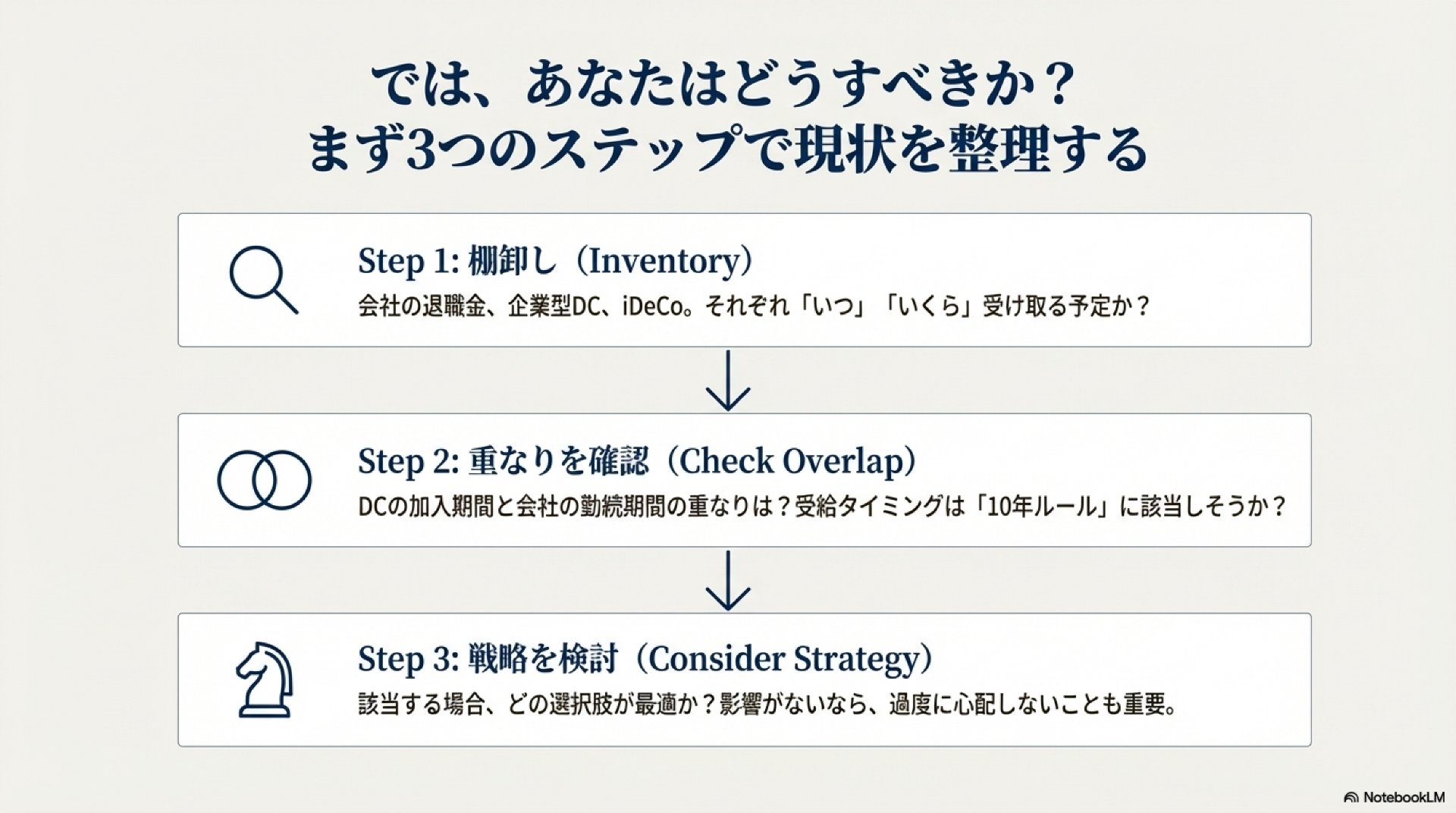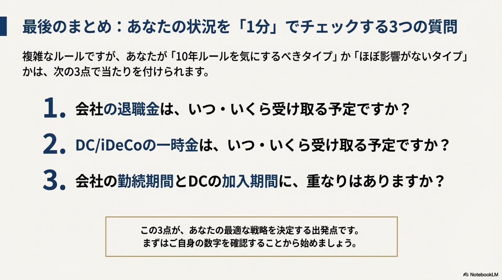 これらの情報を基に、「10年ルール」の影響度合いを判定し、個別のシミュレーションを通じてクライアントにとって最適な受給プラン(タイミング、方法、組み合わせ)を具体化することが、我々の次のアクションとなります。