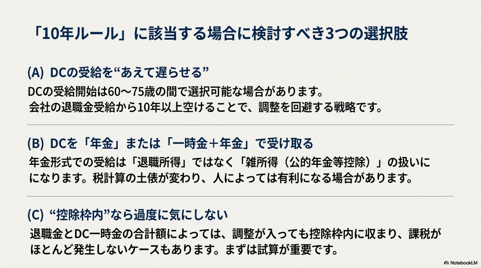 3. 選択肢(C) 影響の試算と受容(現状維持) 会社の退職金とDC一時金の合計額がそれほど大きくない場合、たとえ控除調整が行われたとしても、最終的な課税額への影響が軽微なケースも存在します。10年ルールを回避するために受給計画を複雑化させるよりも、影響額を事前に正確に試算し、許容範囲内であれば従来通りのプランを維持するという判断も合理的です。戦略決定の鍵は、事前の正確なシミュレーションにあります。