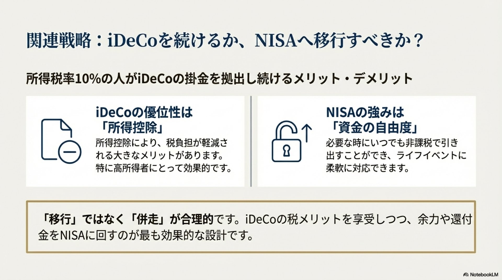 したがって、クライアントへの最適な提案は、iDeCoからNISAへの「移行」ではなく、両者を巧みに活用する「併走」です。iDeCoの強力な所得控除メリットを最大限享受しつつ、余剰資金や税還付分を流動性の高いNISAに回す戦略が、最も合理的かつ安全な設計と言えるでしょう。
