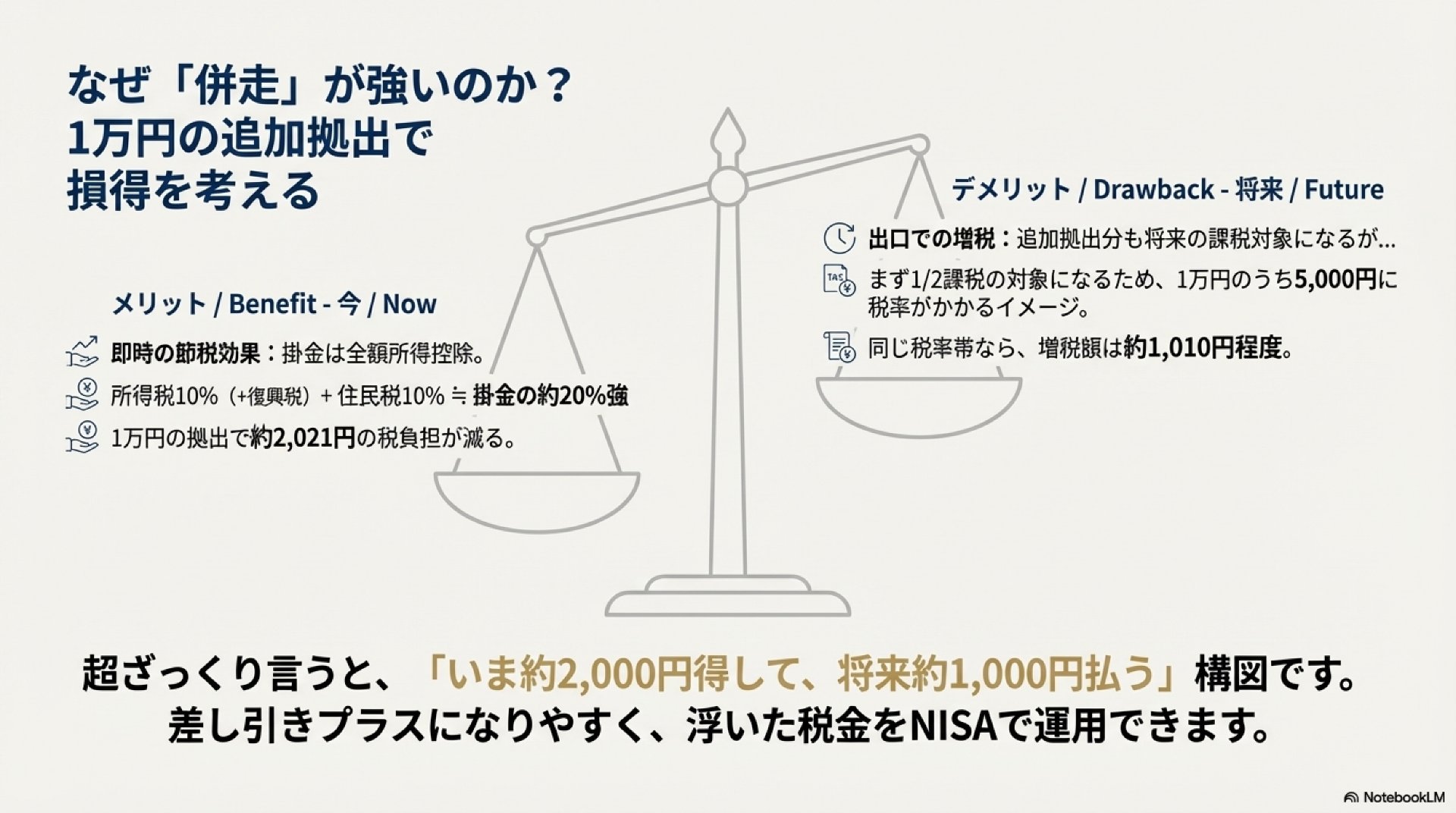 • 結論: 差し引きでプラスになりやすく、さらに「現在浮いた税金」をNISAで運用できるという二重のメリットがあります。
