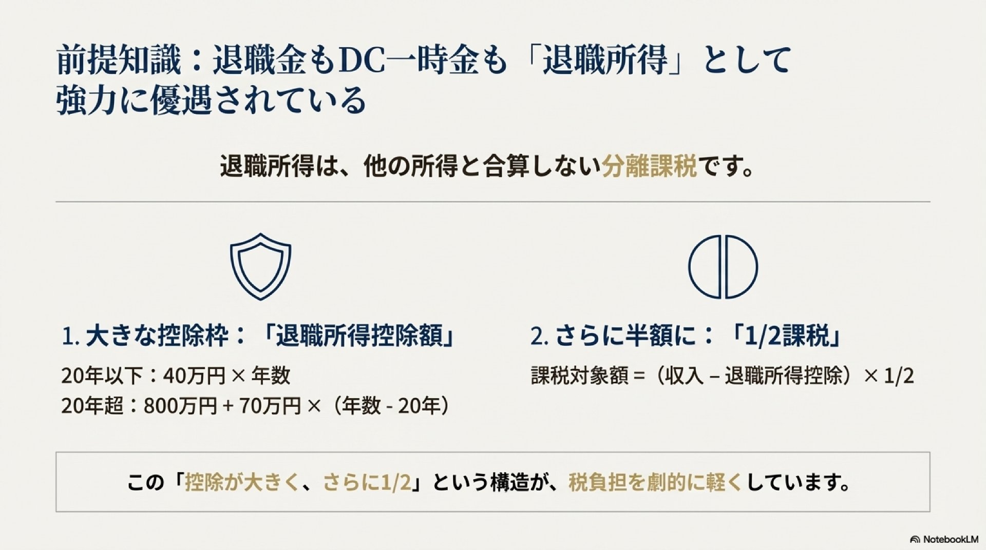 ※ただし、この「年40万円」は簡略化したモデルです。実際には、勤続年数が20年を超える部分は控除単価が変わり、また先に受けた退職所得が控除枠を使い切っていない場合の按分計算など、詳細な規定があるため、個別の計算には注意が必要です。