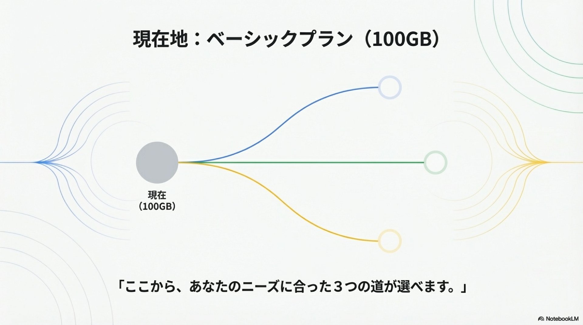 - 状況: 100GBを使い切ったけど、劇的に増える予定はない。
