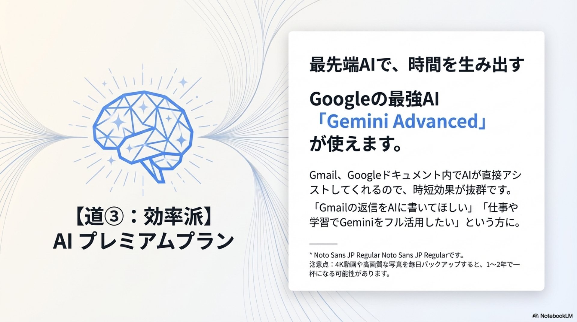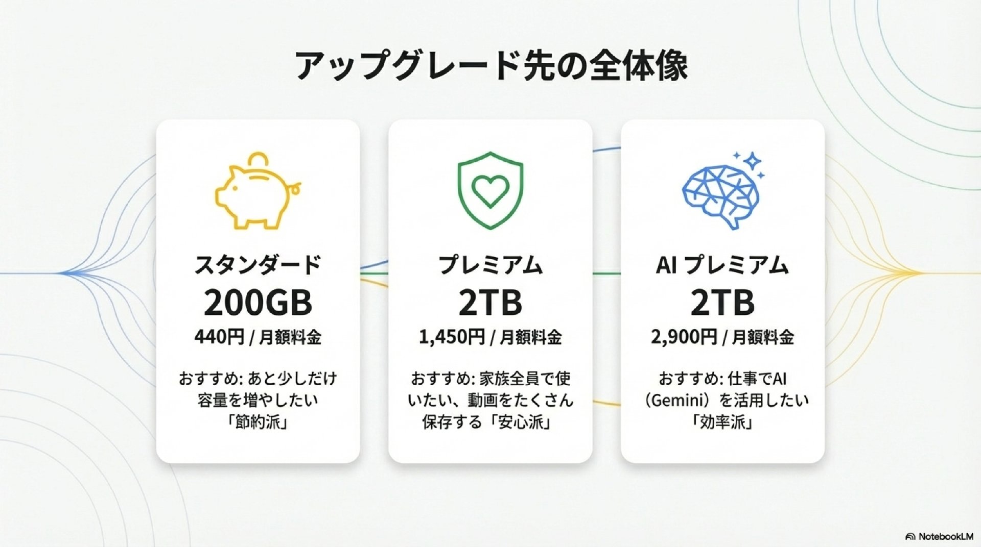 | AI プレミアム | 2TB | 2,900円 | 仕事でAI(Gemini)を活用したい「効率派」 |