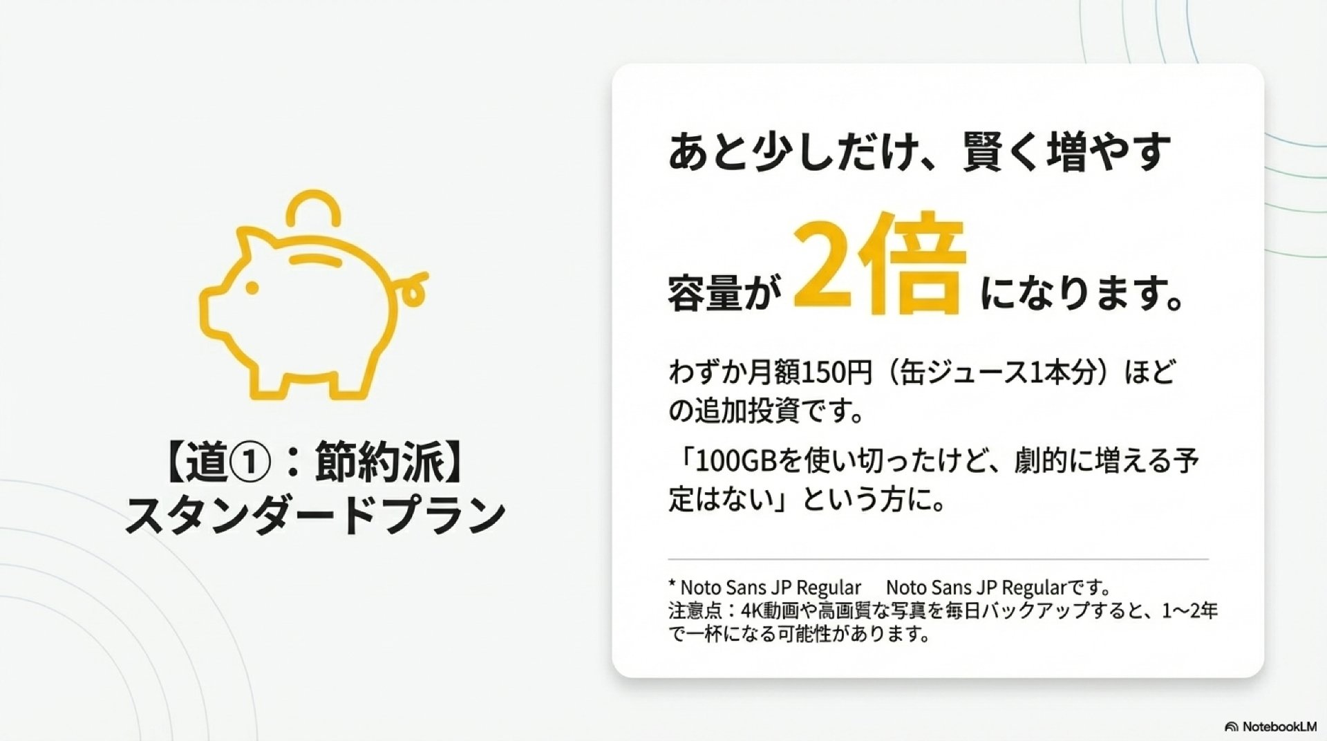 - メリット: わずか月額150円(缶ジュース1本分)ほどの追加で、容量が「2倍」になります。