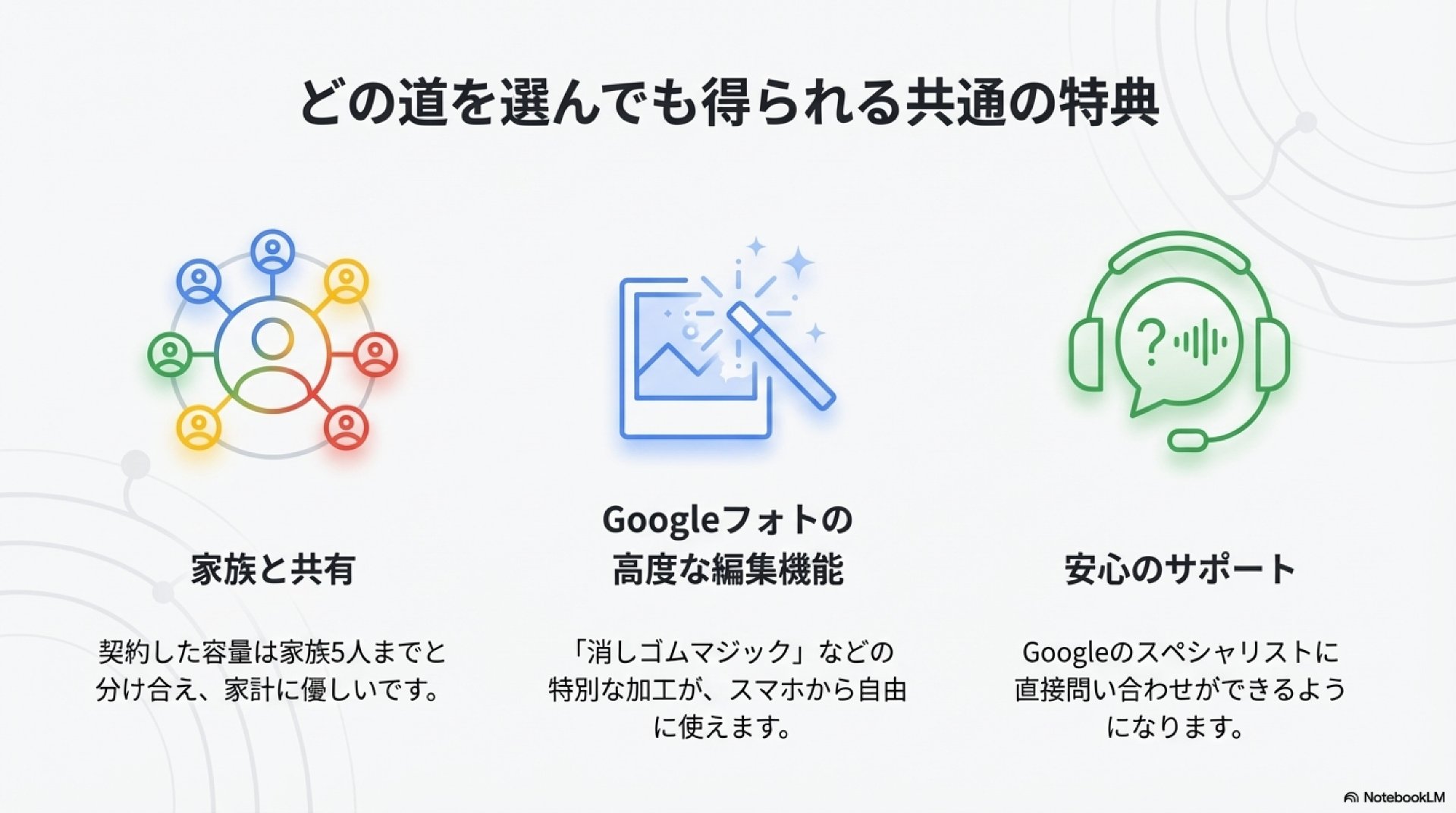 - メリット: 2TBの容量に加え、Googleの最強AI「Gemini Advanced」が使えます。Gmail、Googleドキュメント内でAIが直接アシストしてくれるので、時短効果が抜群です。
