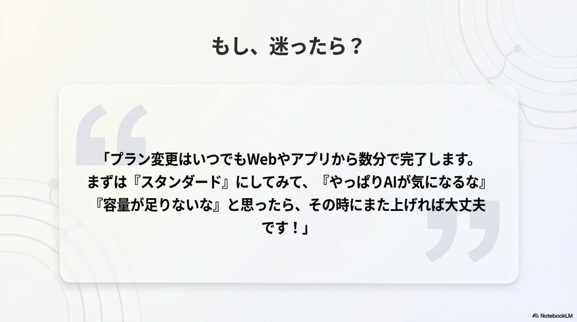 プラン変更はいつでもWebやアプリから数分で完了します。まずは「スタンダード」にしてみて、「やっぱりAIが気になるな」「容量が足りないな」と思ったら、その時にまた上げれば大丈夫です!