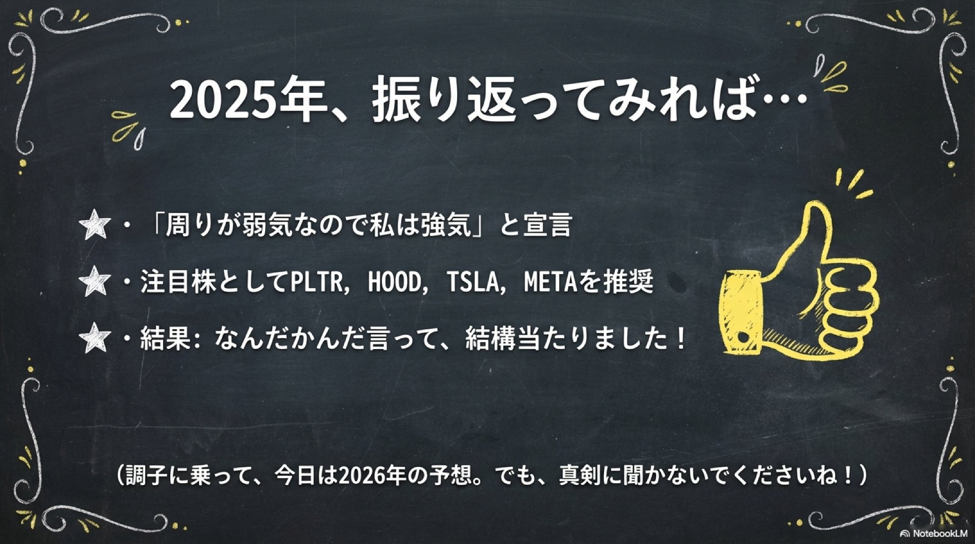 年初(1/6)で、CESなども重なり「今年の相場観をどこに置くか」がポジションやメンタルに直結するタイミングです。まりーさんの2025年の的中体験がある分、2026年も“羅針盤”として採用したくなる一方、過去の的中が次の年の“過信”にもつながりやすい。ここを冷静に点検したい、という問いに見えます。