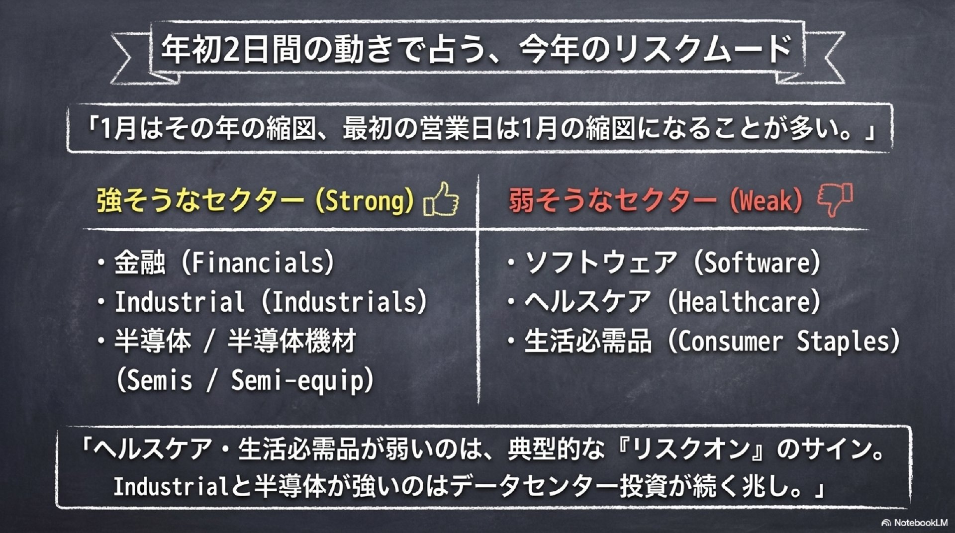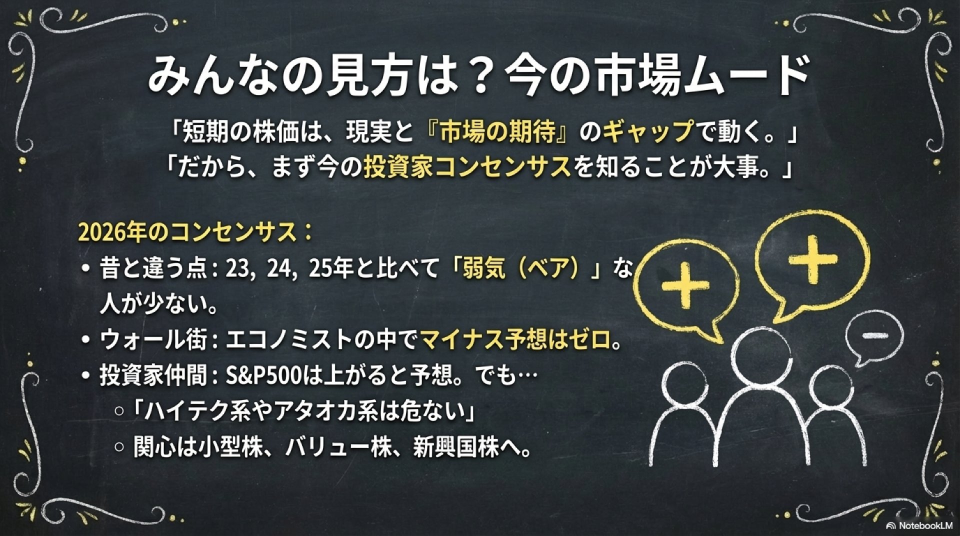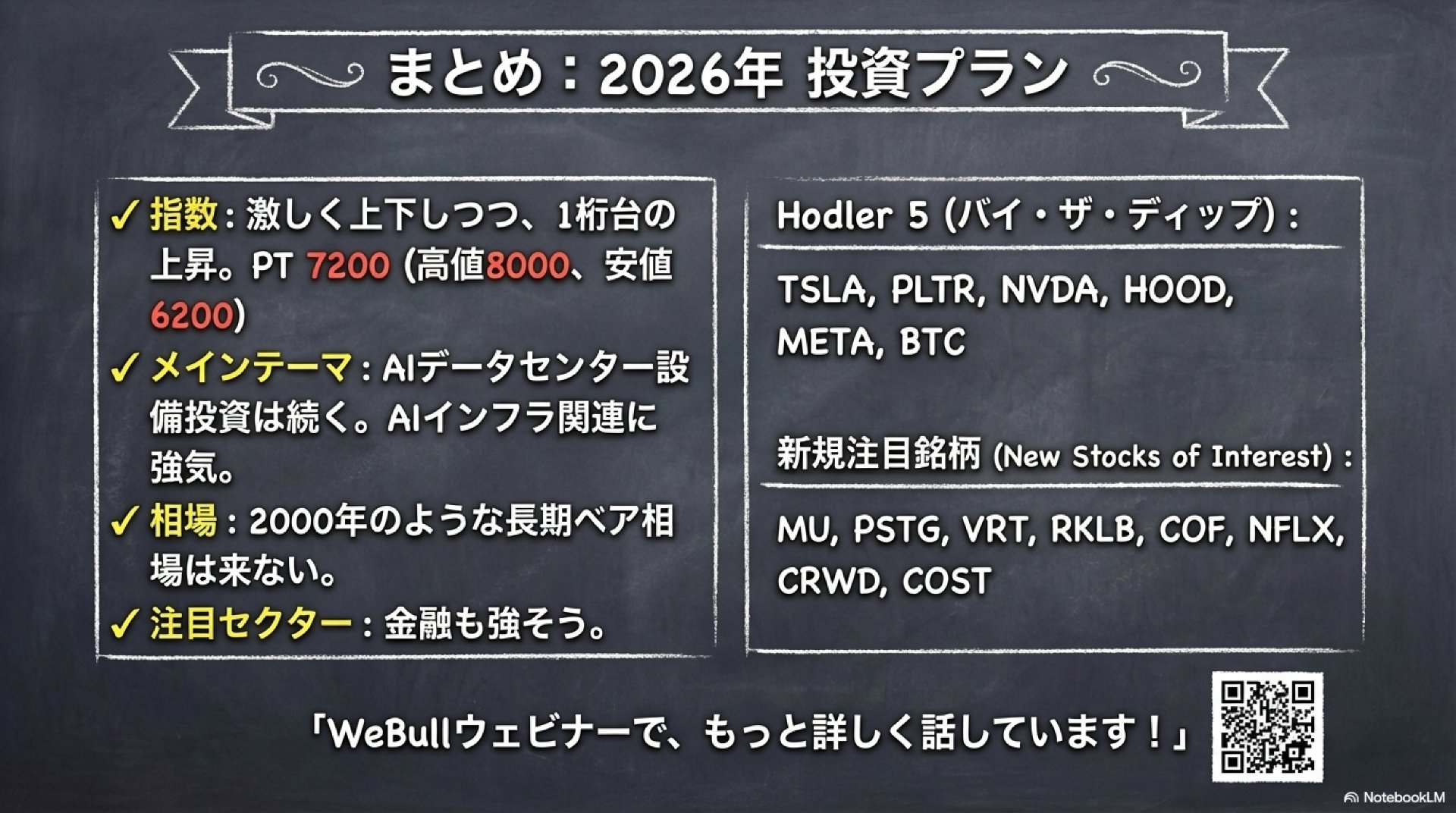結論として、まりーさんの「2026年=上下に振れつつ通年ではプラス、AIインフラは継続、2000–2003型の長期ベアは来にくい」という“ベースケース”は、現時点のウォール街コンセンサスの中にきちんと収まっていて、極端に無理な主張ではありません。一方で、強気の根拠として置いている前提のうち「崩れ方が速い箇所」がいくつかあり、そこを監視しないまま“バイザディップの信念”だけで運用すると、当たり外れ以前にリスク管理が弱くなります。