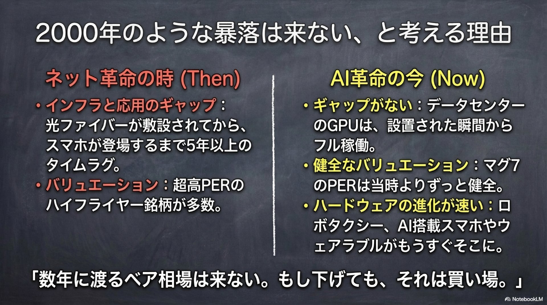 評価:AI強気は主流寄りで妥当。ただし「2000–2003型の長期ベアは来ない」は、“来ない”と言い切るより、**来ない前提が崩れる条件(何が起きたら撤回するか)**が必要です。