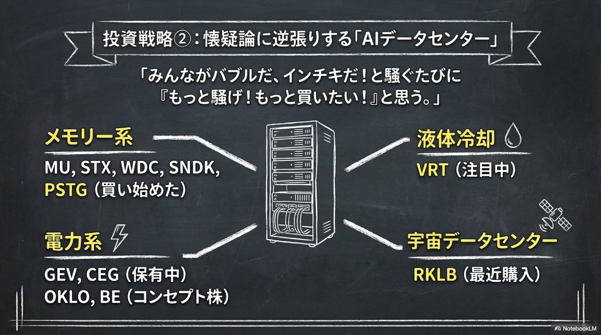ここを“全部HODLで同列”に扱うと、下げ局面で心理的負荷が跳ねます。 - AIインフラの周辺サイクル(MU, STX, WDC, VRT など)