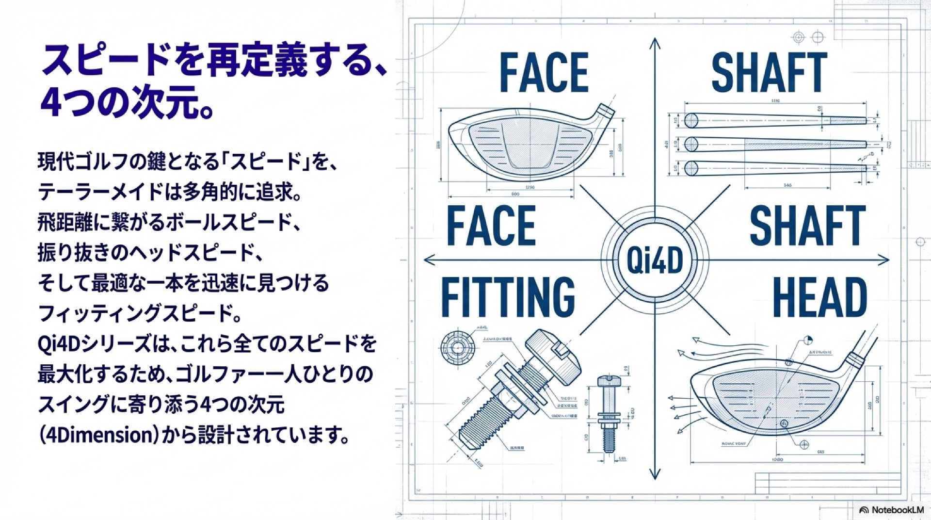 『Qi4D』シリーズの核心を成すのは、FACE、HEAD、SHAFT、FITTINGの4つの要素が有機的に連携する「4Dimension」コンセプトです。このプラットフォームは、単一技術の優位性だけでなく、各要素の相乗効果によって、ゴルファー一人ひとりに最適化されたスピードと安定性を提供することを戦略的目標としています。