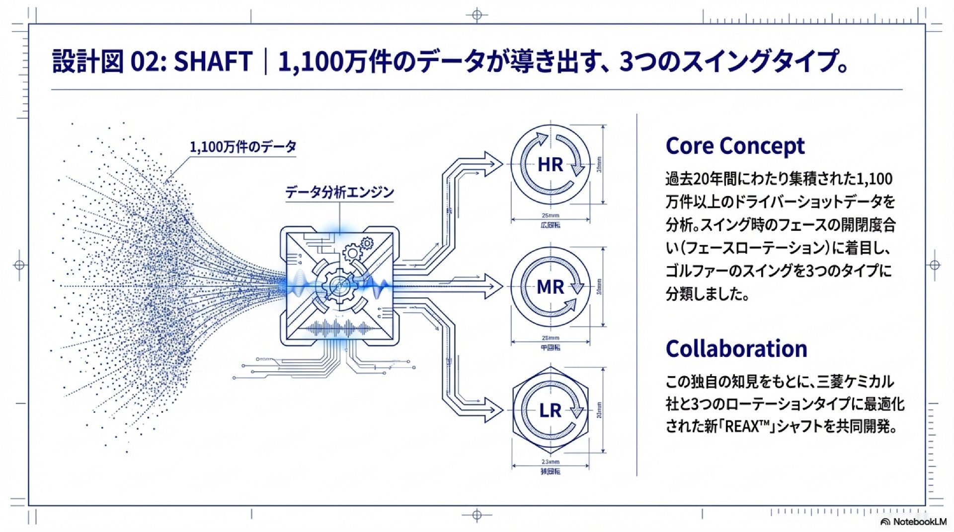 シャフト開発においては、過去20年間にわたり蓄積された1,100万件以上の膨大なショットデータを分析。このデータドリブンなアプローチにより、ゴルファーのスイングをフェースの開閉度合い(フェースローテーション)から3つのタイプに分類し、三菱ケミカル社と共同で各タイプに最適な新『REAX™』シャフトを開発しました。