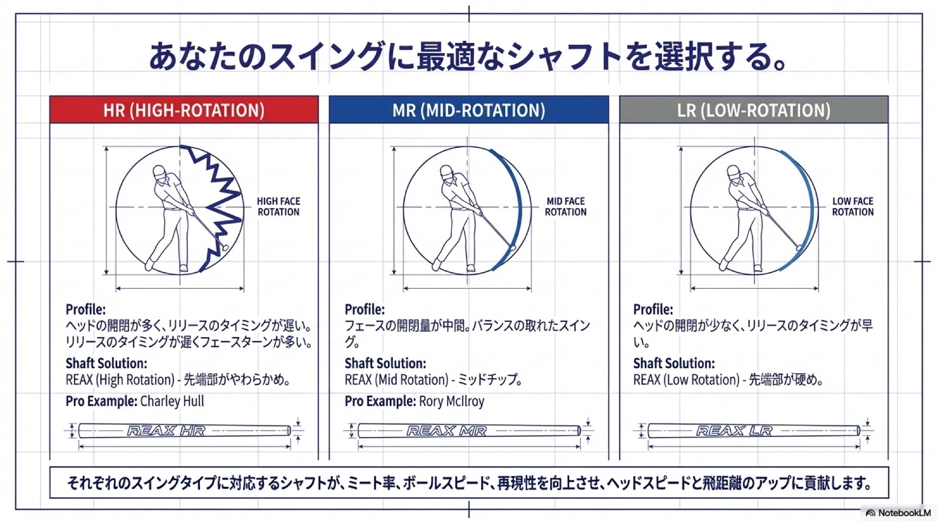 | LR (ローローテーション) | ヘッドの開閉が少なく、リリースが早い | 先端部が硬め | Collin Morikawa |