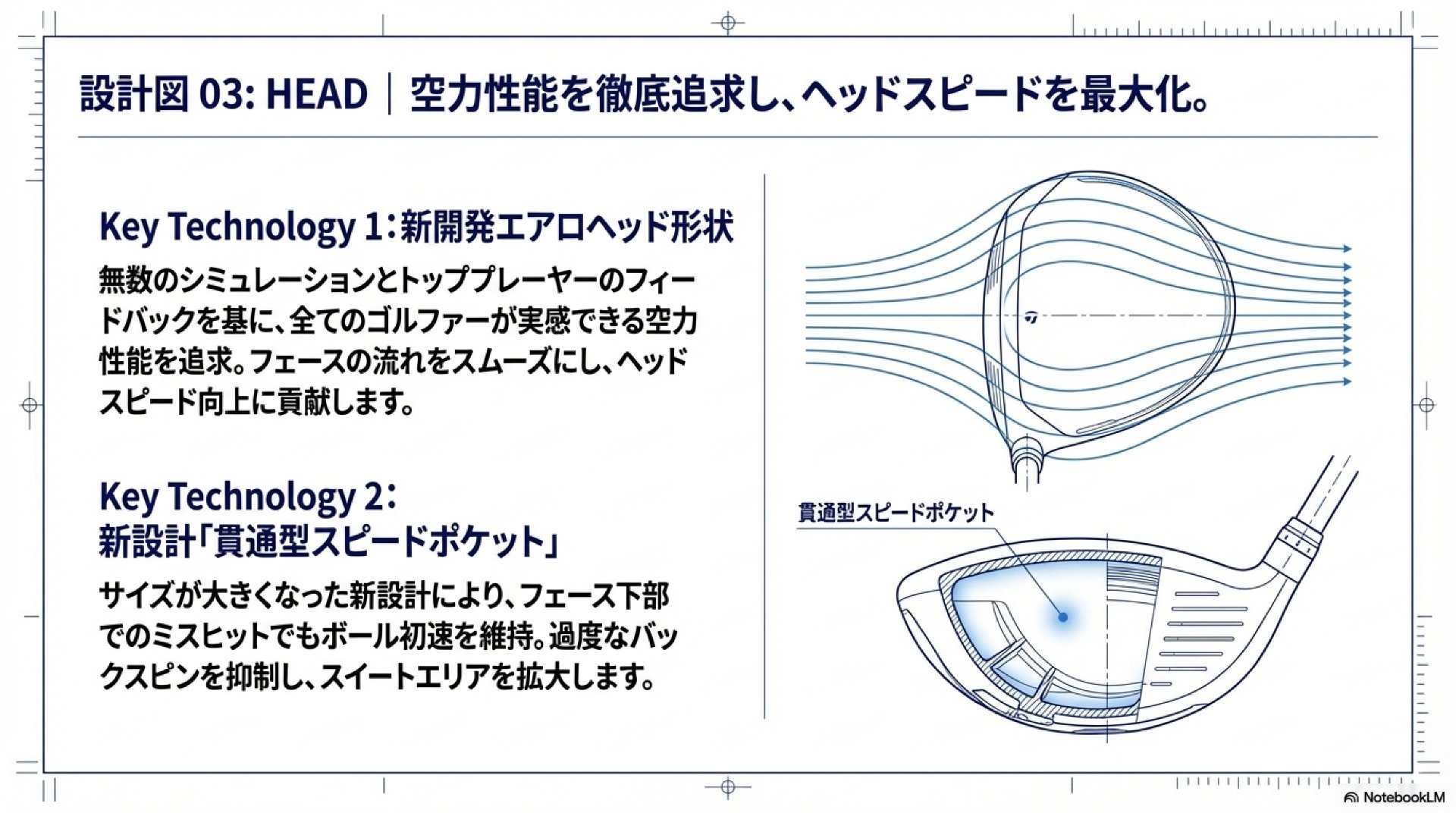 ヘッド形状は、無数のシミュレーションとトッププレーヤーからのフィードバックに基づき、すべてのゴルファーが空力性能の向上を実感できるよう新たに開発されました。フェースからヘッド後方へのスムーズな空気の流れを実現することで、スイング中の空気抵抗を抑制し、ヘッドスピードの向上に直接的に貢献します。このヘッド開発の根底には「求めるのは、剛速か柔速か」というマーケティングコンセプトが存在します。ヘッドの設計思想を二分化し、操作性と力強さを追求する「剛速」と、寛容性とやさしさを追求する「柔速」という、異なるタイプのスピードと打感を提供。これにより、ゴルファーの好みやニーズに応じた最適なヘッド選択を可能にしています。