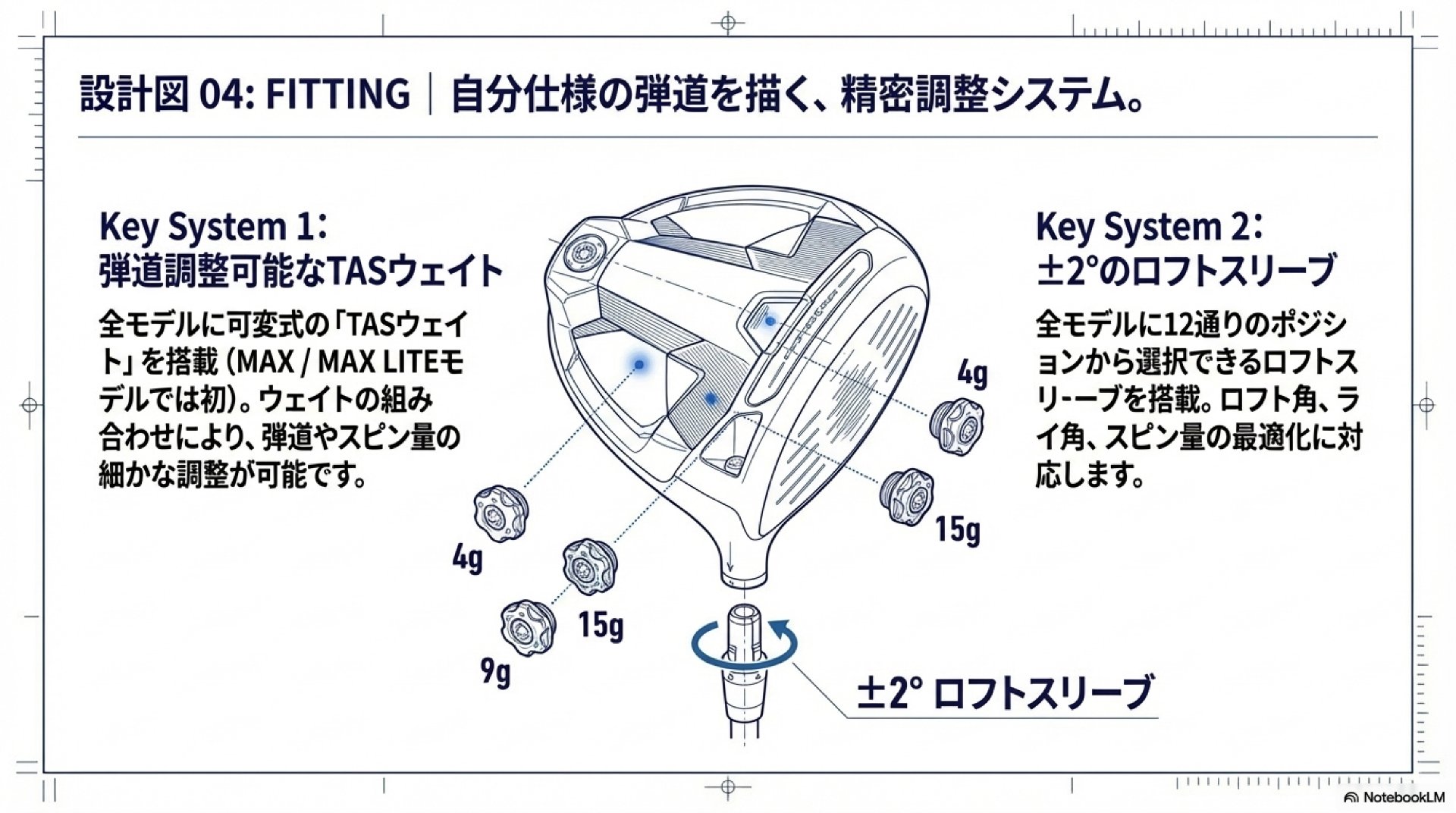 - TASウェイト(TRAJECTORY ADJUSTMENT SYSTEM): モデルごとに最適化された可変式ウェイトにより、弾道、バイアス、スピン量を細かく調整可能です。