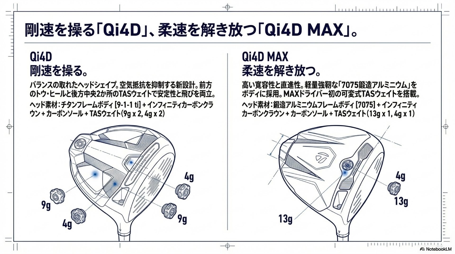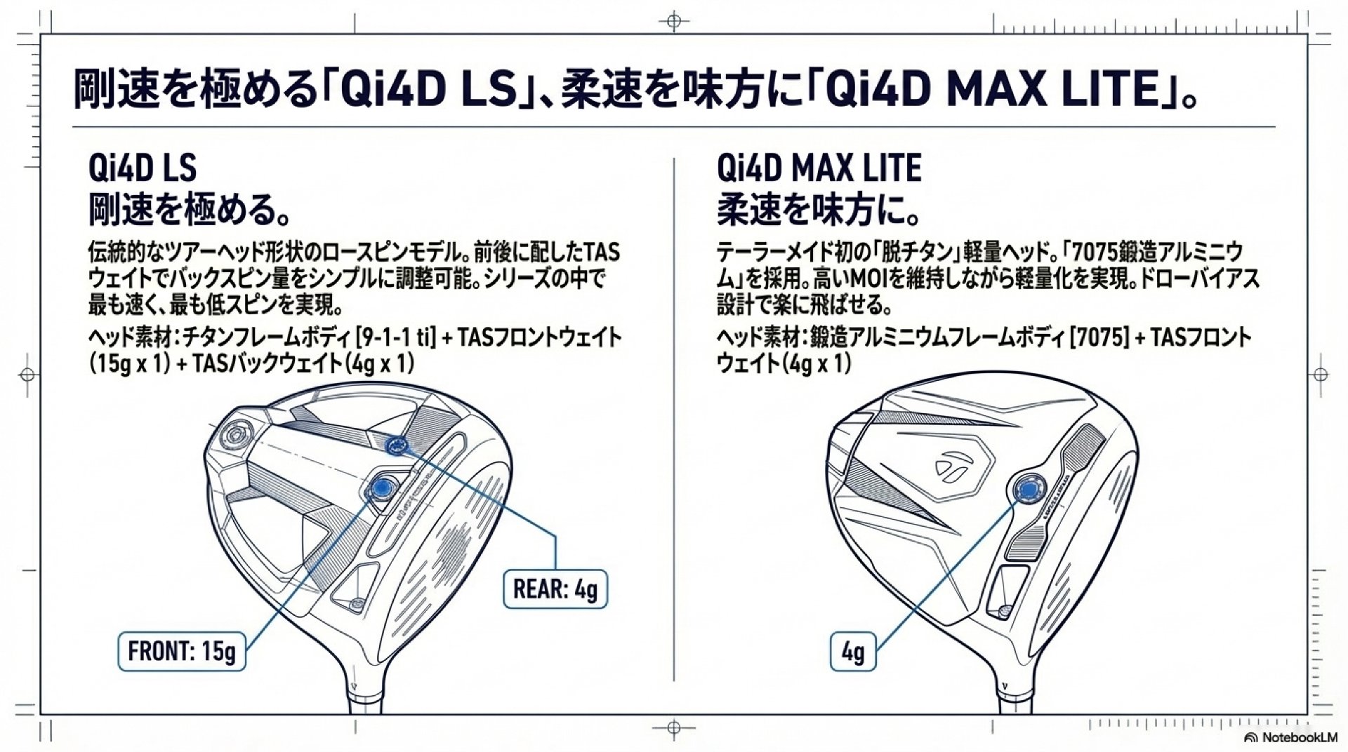 - Qi4D LS: 前方1個(15g)、後方1個(4g)のウェイトを搭載し、シンプルかつ効果的なバックスピン量の最適化を実現。