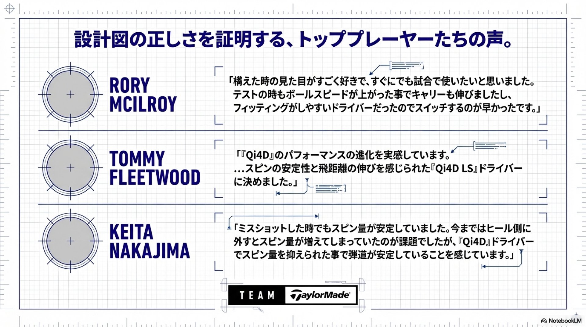 製品の技術的優位性を客観的に証明し、市場での信頼性を確立する上で、トッププロによる実戦での評価は極めて重要です。『Qi4D』シリーズは、既にチーム・テーラーメイドのトップ選手たちから高い評価を得ており、そのフィードバックは我々のマーケティング活動における強力な裏付けとなります。