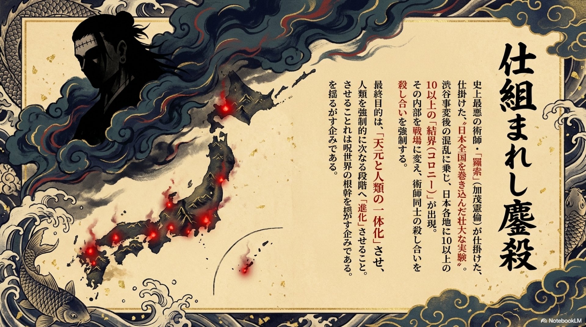 「死滅回游」とは、史上最悪の術師と称される羂索(けんじゃく)によって計画・実行された、術師同士の殺し合いを強制するゲームである。その本質は、日本全国を巻き込んだ壮大な呪術的「実験」であり、彼の最終目的に向けた儀式の一環として位置づけられている。