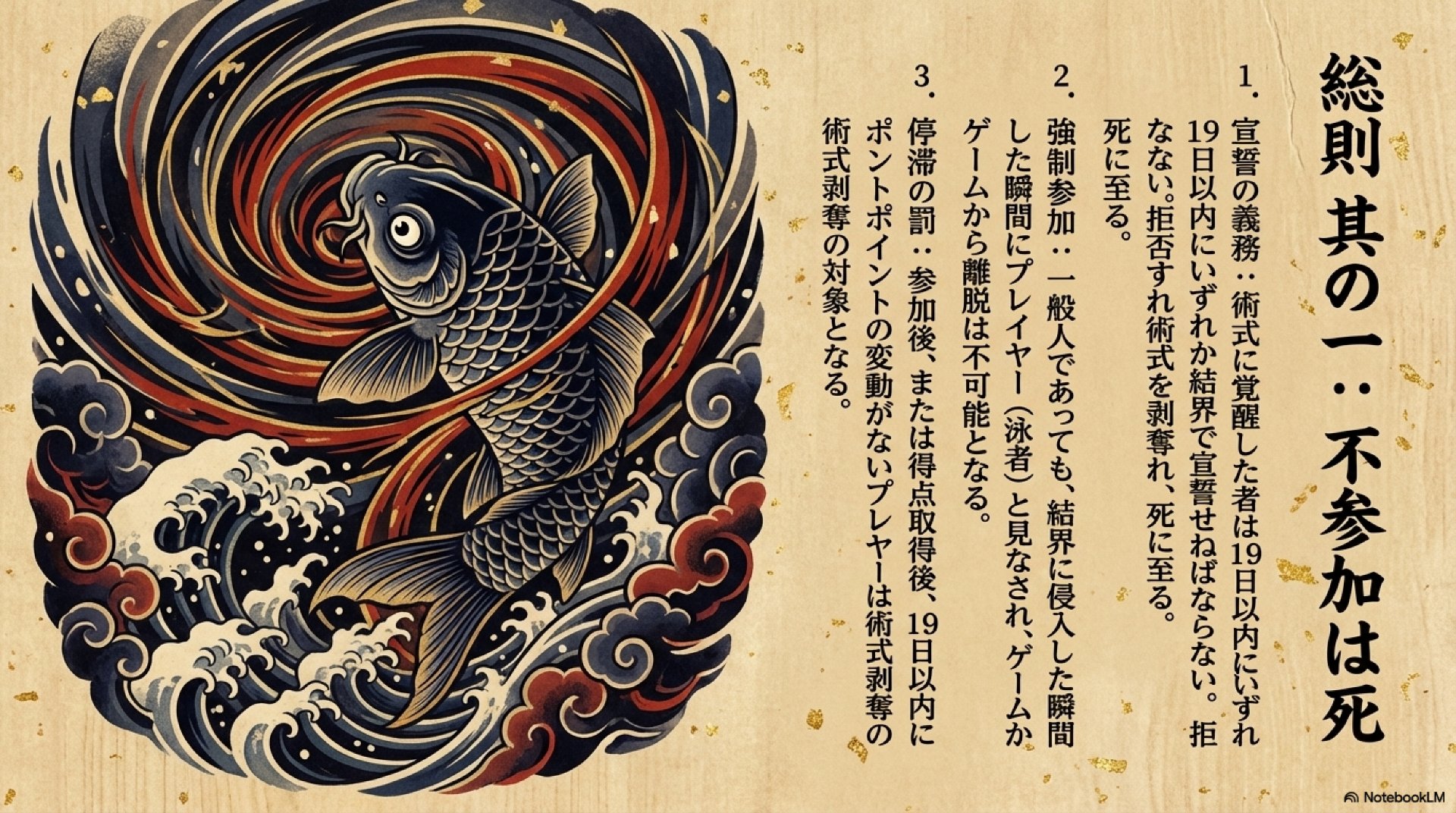 - ペナルティ 参加または最初の得点取得から19日以内にポイントの変動がない場合、術式剥奪のペナルティが科される。これは実質的な死を意味し、プレイヤーが戦闘を避け、停滞することを許さない。このルールこそが、ゲームを永続的に稼働させるためのエンジンであり、登場人物たちを絶え間ない戦いへと駆り立てる。