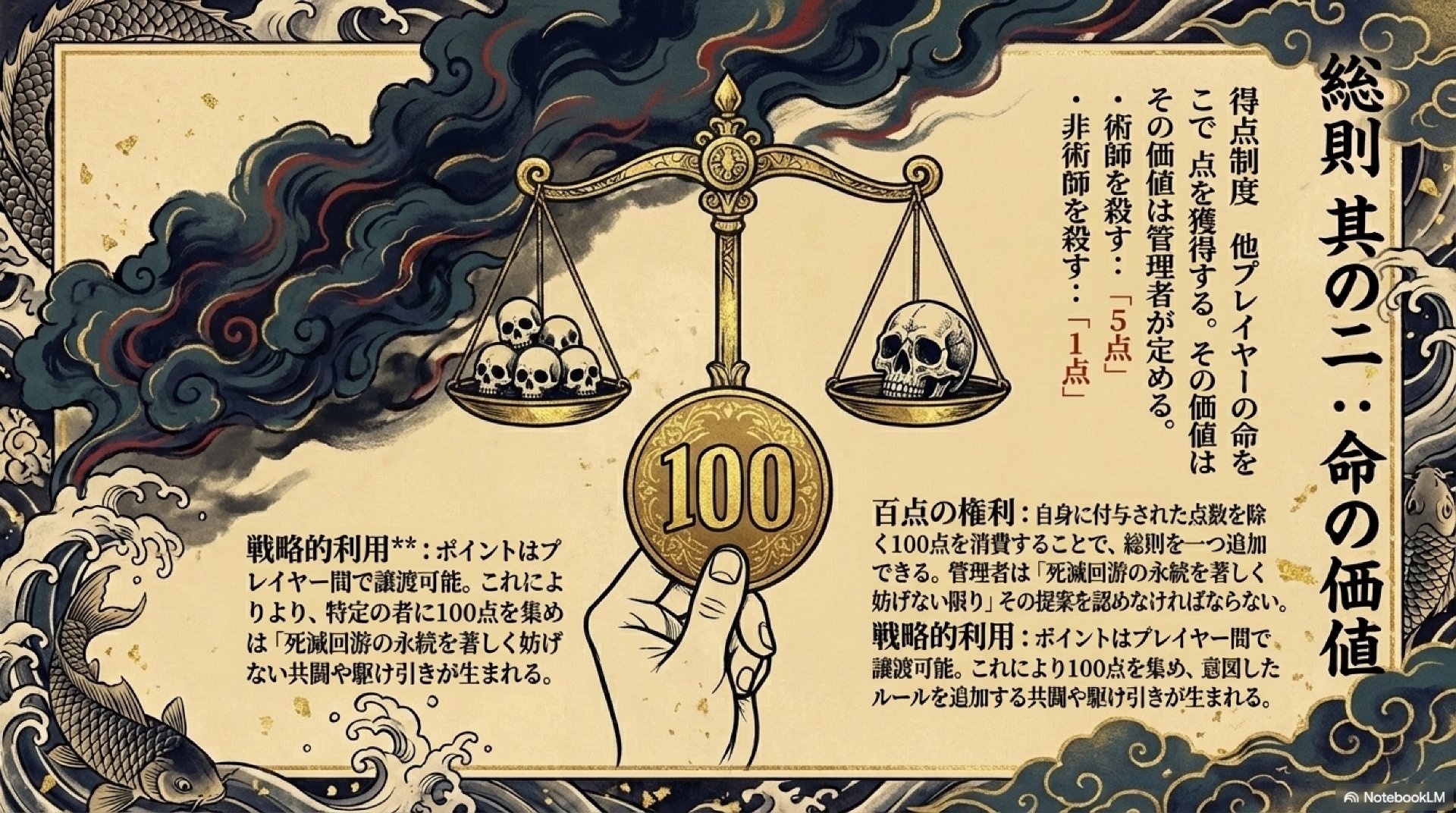 - 戦略的目標の創出: 主人公サイドは、このルールを利用して「死滅回游からの離脱」という抜け道を作ろうと試みる。これにより、彼らの行動は単なる場当たり的な戦闘ではなく、100ポイント獲得という明確な目標に基づいた作戦行動となる。