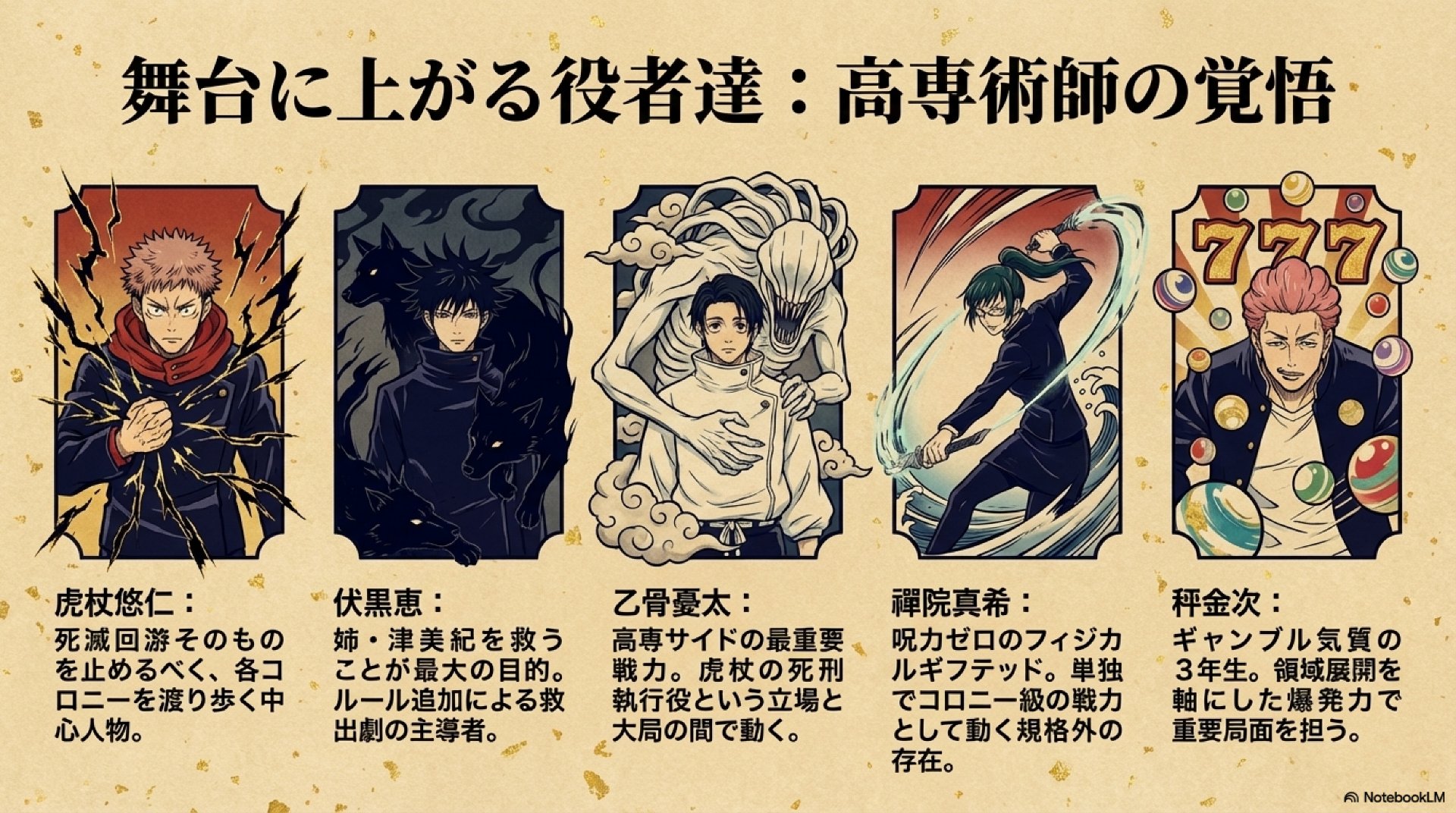- 乙骨憂太は、仙台結界を単独で平定するなど、その圧倒的な戦闘力で戦局そのものを覆す役割を担う。
