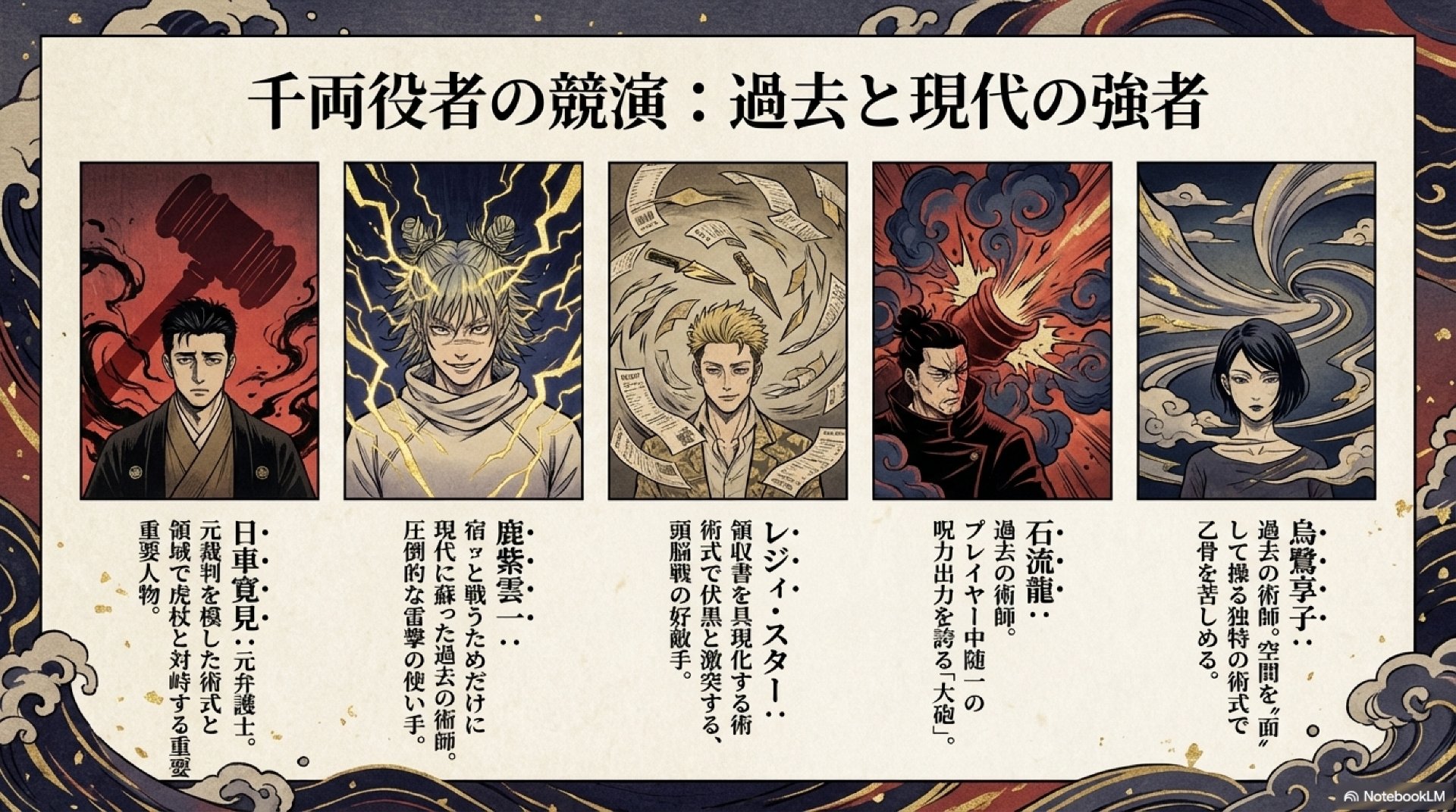 - 石流龍・烏鷺享子: 過去の時代の強者たち。乙骨憂太の規格外の呪力量と総合的な戦闘能力を読者に知らしめるための「強さの指標」としての役割を担う。