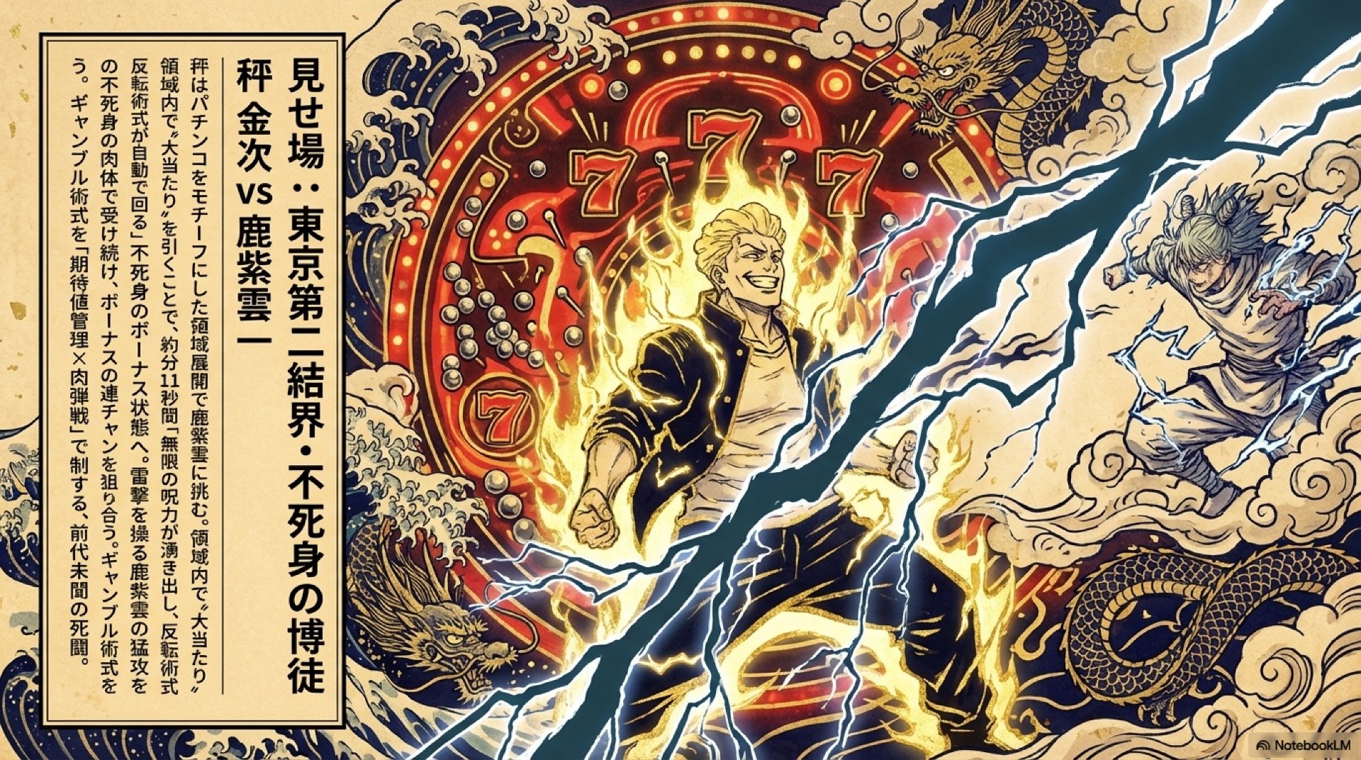 - ギャンブルの戦略的活用: 秤の領域展開は、パチンコをモチーフにした一見すると運任せの能力である。しかし彼は、その“当たり”がもたらす「不死身のボーナスタイム」を前提に、期待値を管理し、リスクを計算した上で肉弾戦を挑む。ギャンブルという不安定な要素を、再現性のある戦略へと昇華させる彼の思考と気質が、この戦闘を通じて鮮やかに描き出されている。