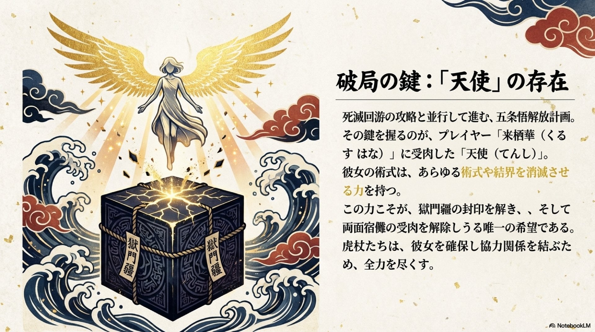 - 来栖華(天使)の持つ「術式消滅」能力は、五条悟解放や宿儺対策の鍵であり、彼女の確保がチームの戦略的目標となる。