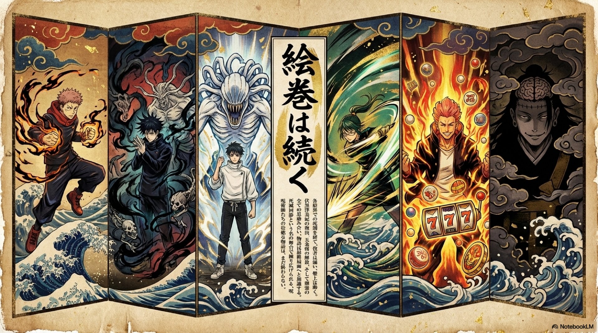 - 新旧キャラクターの交錯と成長の促進 鹿紫雲一や日車寛見といった新たな強敵、さらには過去の術師たちを多数登場させることで、呪術界の歴史的な層の厚さを示した。同時に、彼らとの死闘は虎杖、伏黒、真希といった既存キャラクターに新たな覚醒や精神的成長を促すための、必要不可欠な触媒として機能した。