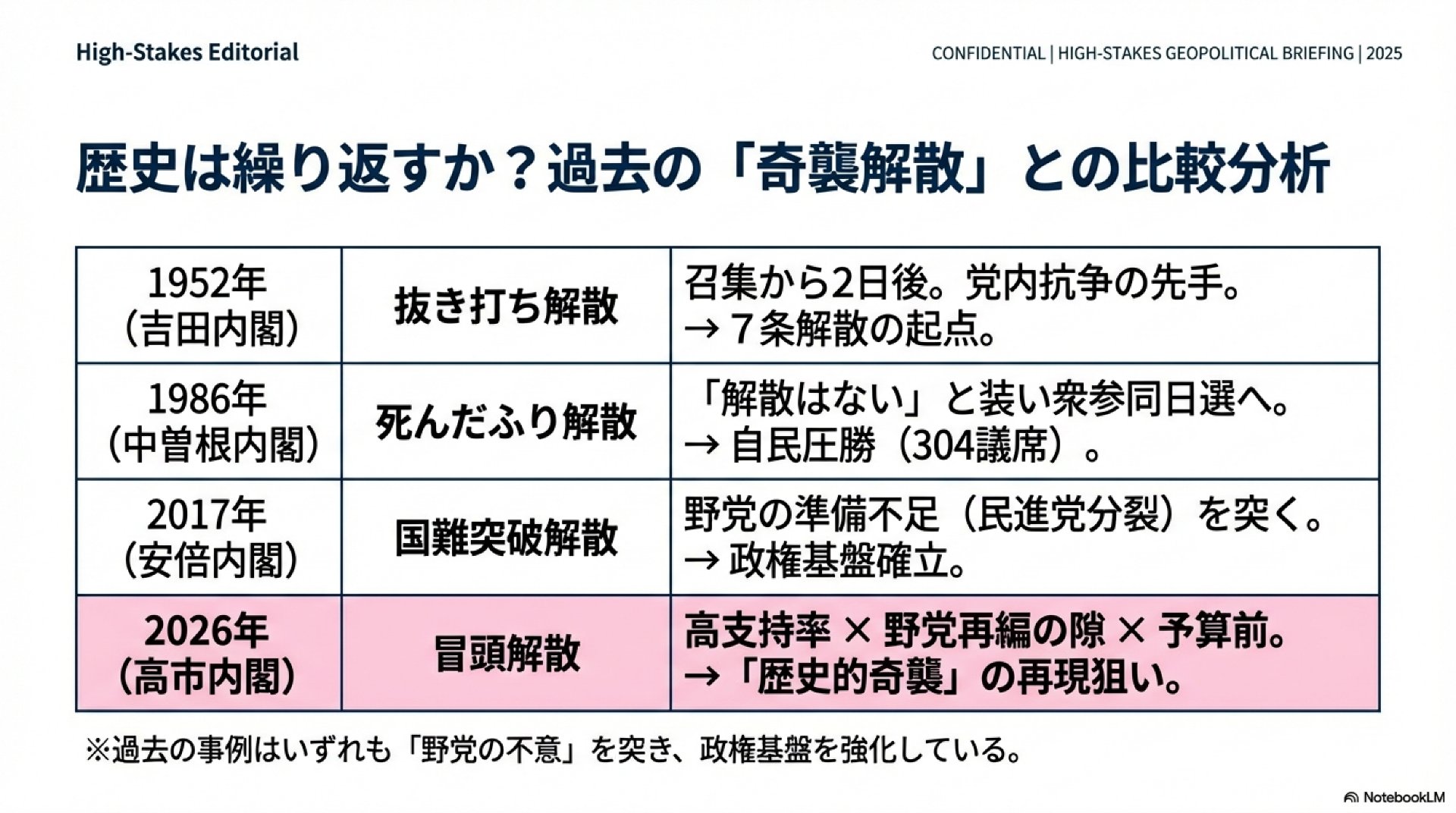 通常、1月から3月にかけての国会は、次年度の予算を審議する最も重要な期間です。戦後、本予算が成立する前の1月に解散した例は、1955年以降でわずか2例(1966年、1990年)しかありません。歴代の首相がこの時期を極力避けてきたのは、予算の成立こそが「納税者である国民への約束」であり、民主主義国家における最低限のルールだと認識していたからです。