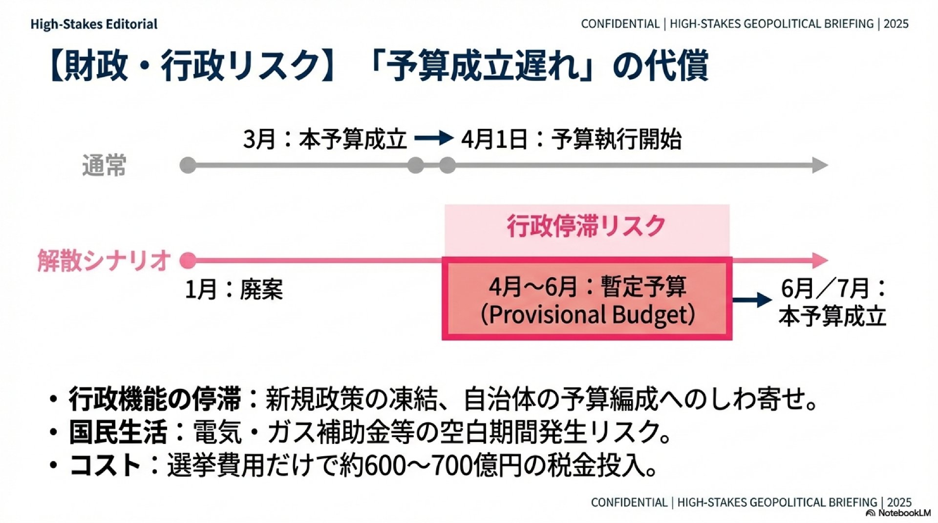今回の解散が強行されれば、予算審議はストップし、年度内の予算成立は絶望的になります。その結果、2014年以来、11年ぶりとなる「暫定予算」の編成が避けられなくなります。