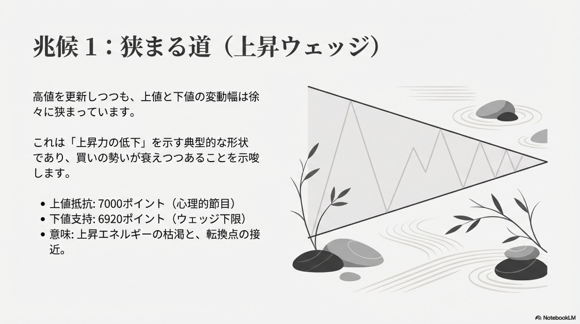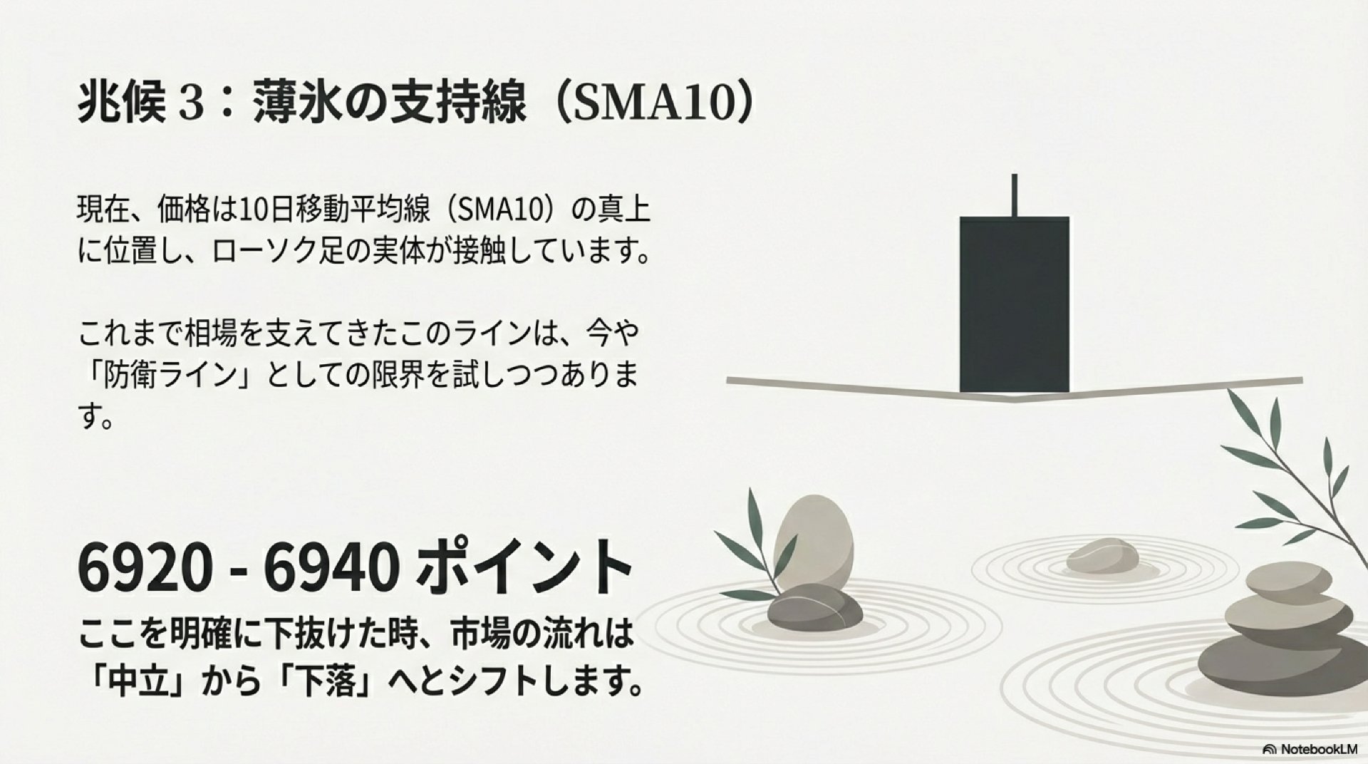 一見すると上昇が続いているように見えますが、テクニカル分析の世界では、この形状は「上昇力の低下」を示す典型的なサインとされています。買いの勢いが徐々に弱まっており、相場が転換点に近づいている可能性を示唆します。特に注目すべきは、心理的な節目である7000ポイントが強力な上値抵抗として意識される一方、下値は6920ポイント付近が防衛ラインとなっている点です。この6920ポイントは、SMA10(10日移動平均線)とウェッジの下限が重なる極めて重要な水準であり、ここを終値で明確に割り込むと、売りが加速する恐れがあります。その場合、6800-6850ゾーンへの調整も視野に入ってきます。