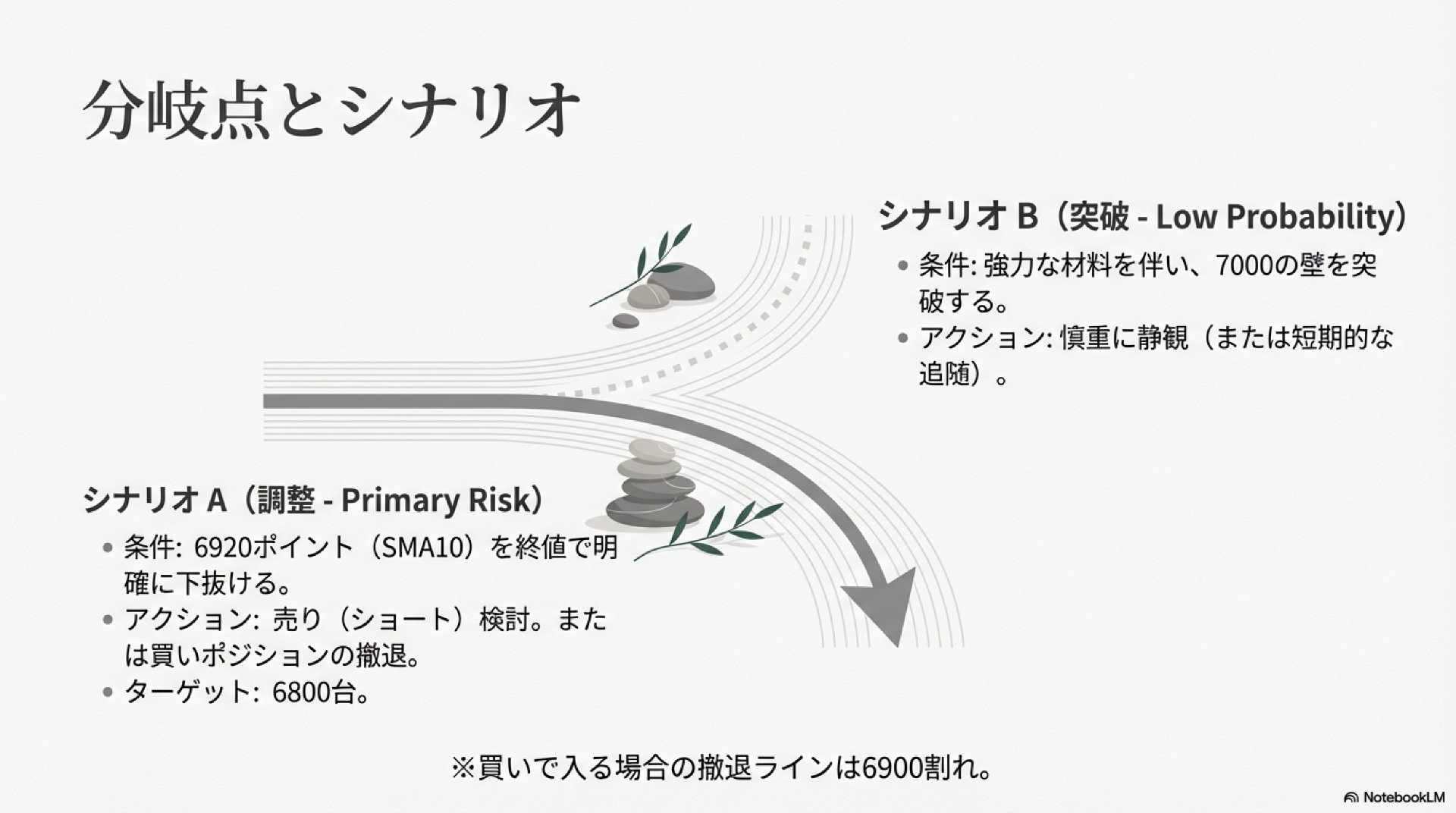 特に、株価がSMA10および6920ポイント(ウェッジの下限)を明確に下抜けて終値が確定した場合は、調整が本格化する合図となりえます。
